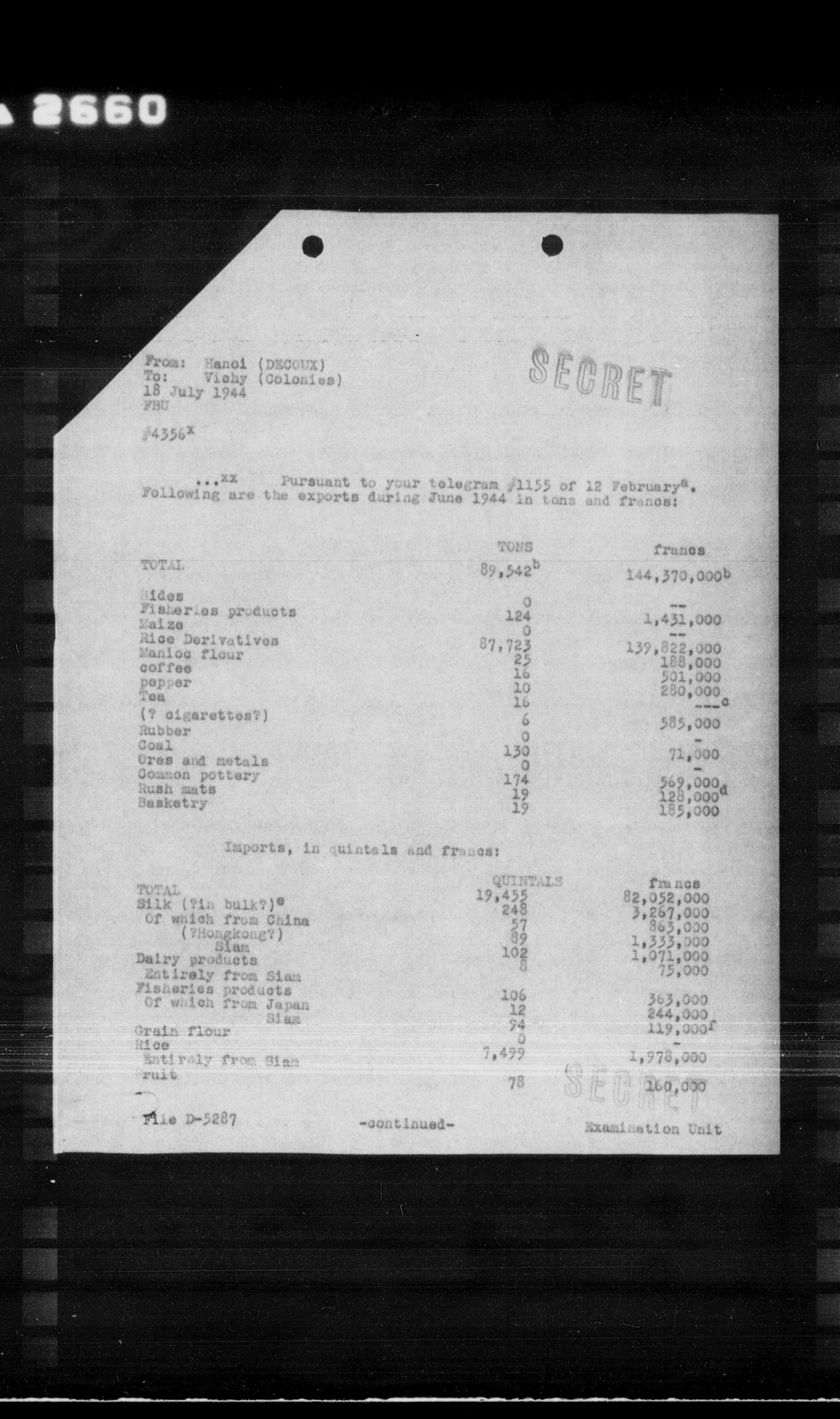 - From: Hanai (DECOUX) To: Vicky (Colonies) 18 July 1944 FNU