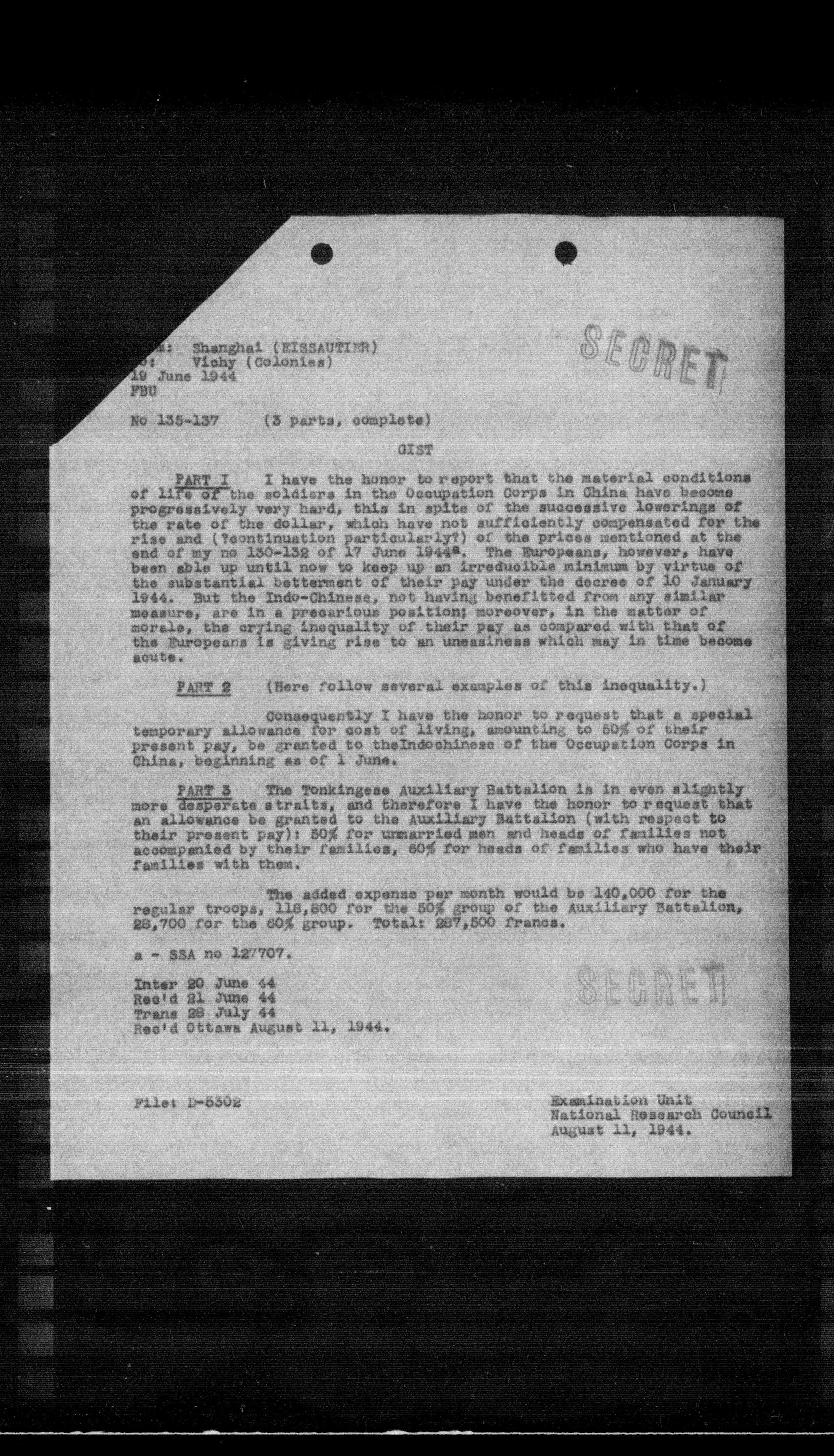 PART I I have the honor to report that the material conditions of life of the soldiers in the Occupation Corps in China have become progressively very hard, this in spite of the successive lowerings of the rate of the dollar, which have not sufficiently compensated for the rise and (recontinuation particularly?) of the prices mentioned at the end of my no 130-132 of 17 June 1944. The Europeans, however, have been able up until now to keep up an irreducible minimum by virtue of the substantial betterment of their pay under the decree of 10 January 1944. But the Indo-Chinese, not having benefitted from any similar measure, are in a precarious position; moreover, in the matter of morale, the crying inequality of their pay as compared with that of the Europeans is giving rise to an uneasiness which may in time become acute.