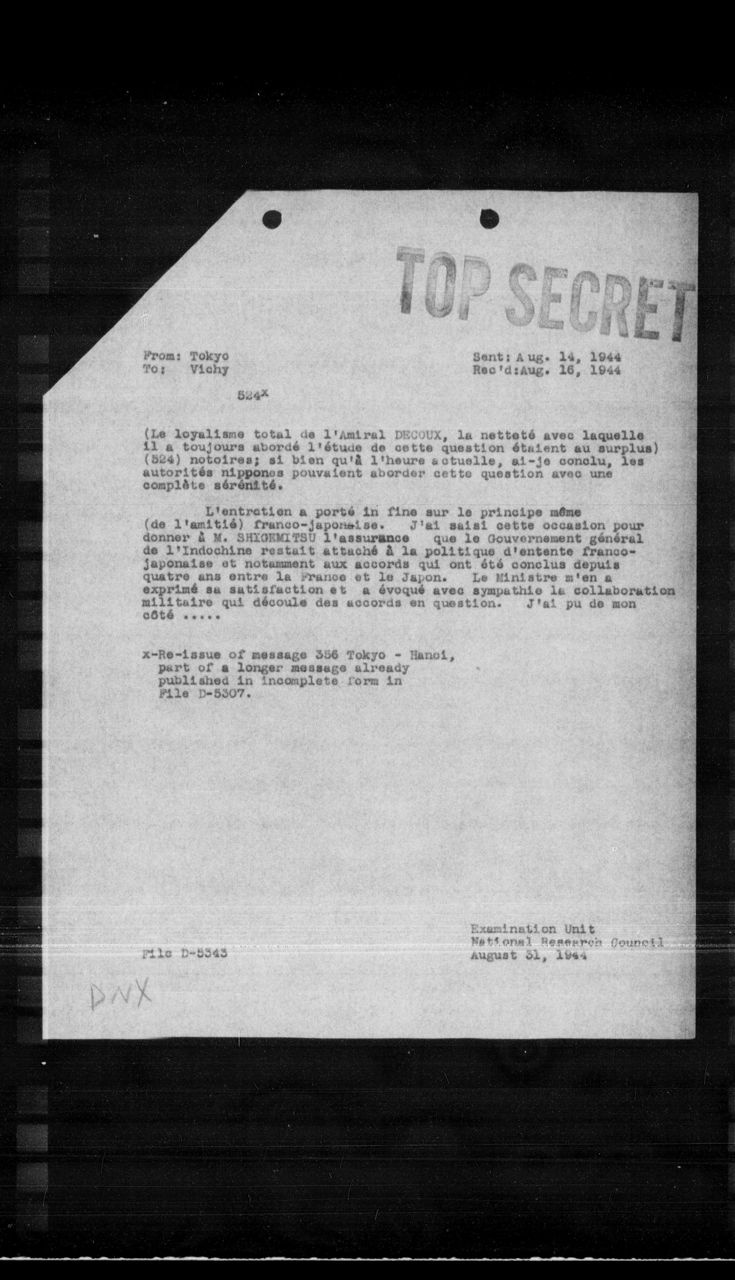 (Le loyalisme total de l'amiral DECOUX, la netteté avec laquelle il a toujours abordé l'étude de cette question étaient au surplus) (524) notoires; si bien qu'd l'heure actuelle, ai-je conclu, les autorités nippones pouvaient aborder cette question avec une complète sérénité.