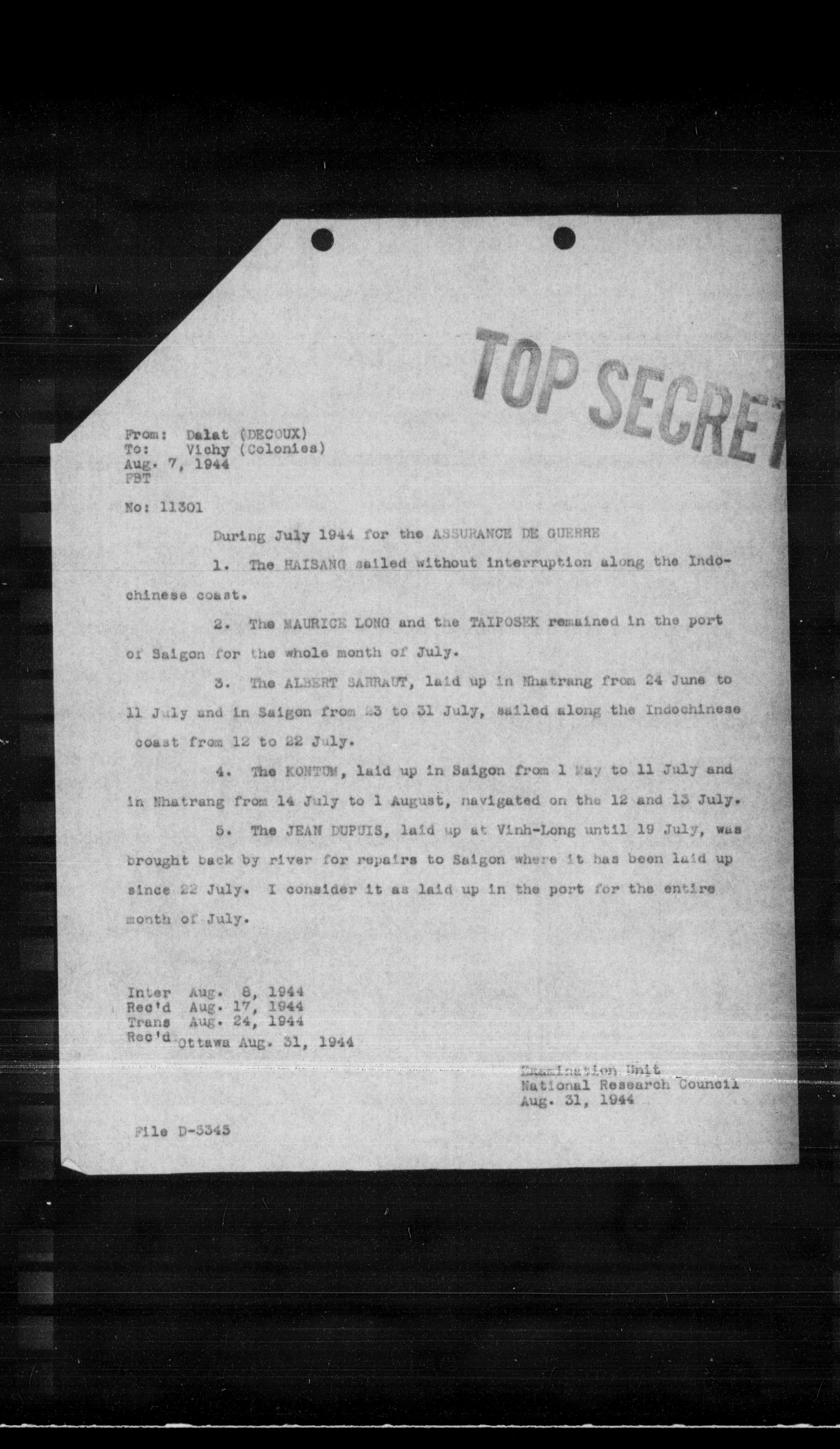 5. The JEAN DUPUIS, laid up at Vinh-Long until 19 July, was brought back by river for repairs to Saigon where it has been laid up since 22 July. I consider it as laid up in the port for the entire month of July.