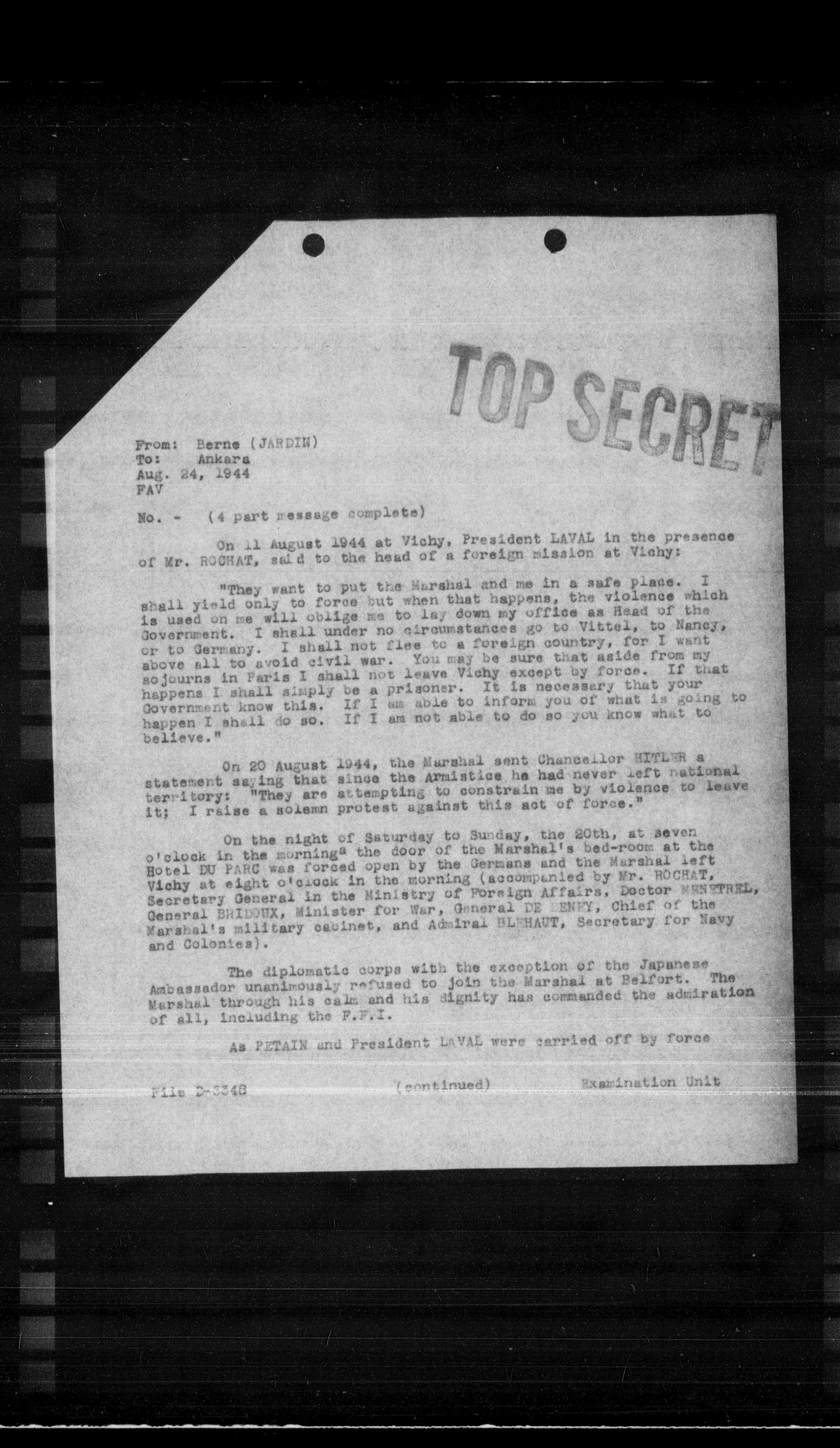On 20 August 1944, the Marshal sent Chancellor HITLER a statement saying that since the Armistice he had never left national territory: "They are attempting to constrain me by violence to leave it; I raise a solemn protest against this act of force."