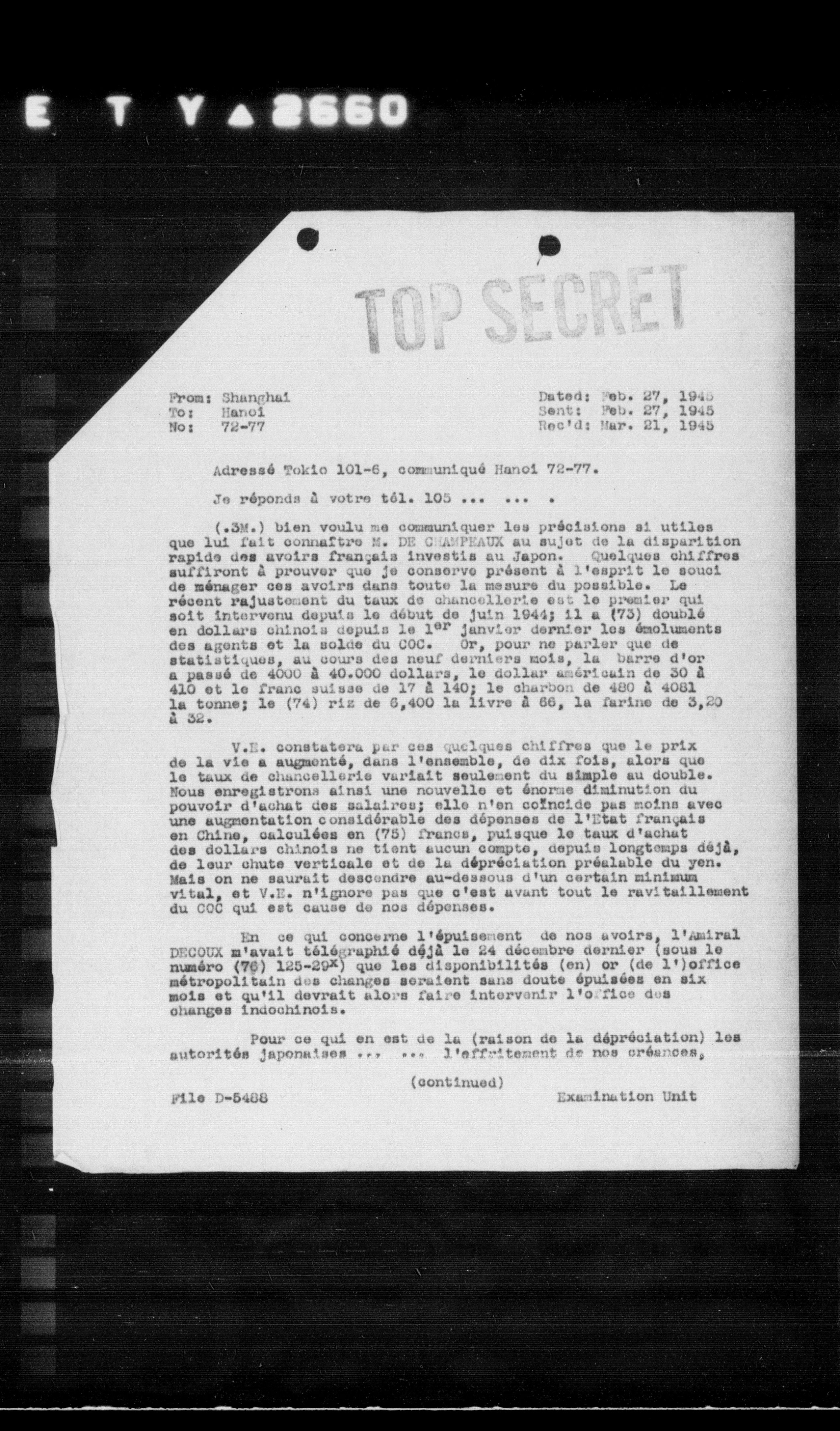 (.3M.) bien voulu me communiquer les précisions si utiles que lui fait connaître M. DE CHANPEAUX au sujet de la disparition rapide des avoirs français investis au Japon. Quelques chiffres suffiront à prouver que je conserve présent à l'esprit le souci de ménager ces avoirs dans toute la mesure du possible. Le récent rajustement du taux de chancellerie est le premier qui soit intervenu depuis le début de juin 1944; il a (73) doublé en dollars chinois depuis le $1^{\text {er }}$ janvier dernier les emoluments des agents et la solde du COC. Or, pour ne parler que de statistiques, au cours des neuf derniers mois, la barre d'or a passé de 4000 à 40.000 dollars, le dollar américain de 30 à 410 et le franc suisse de 17 à 140; le charbon de 480 à 4081 la tonne; le (74) riz de 6,400 la livre à 66 , la farine de 3,20 à 32 .