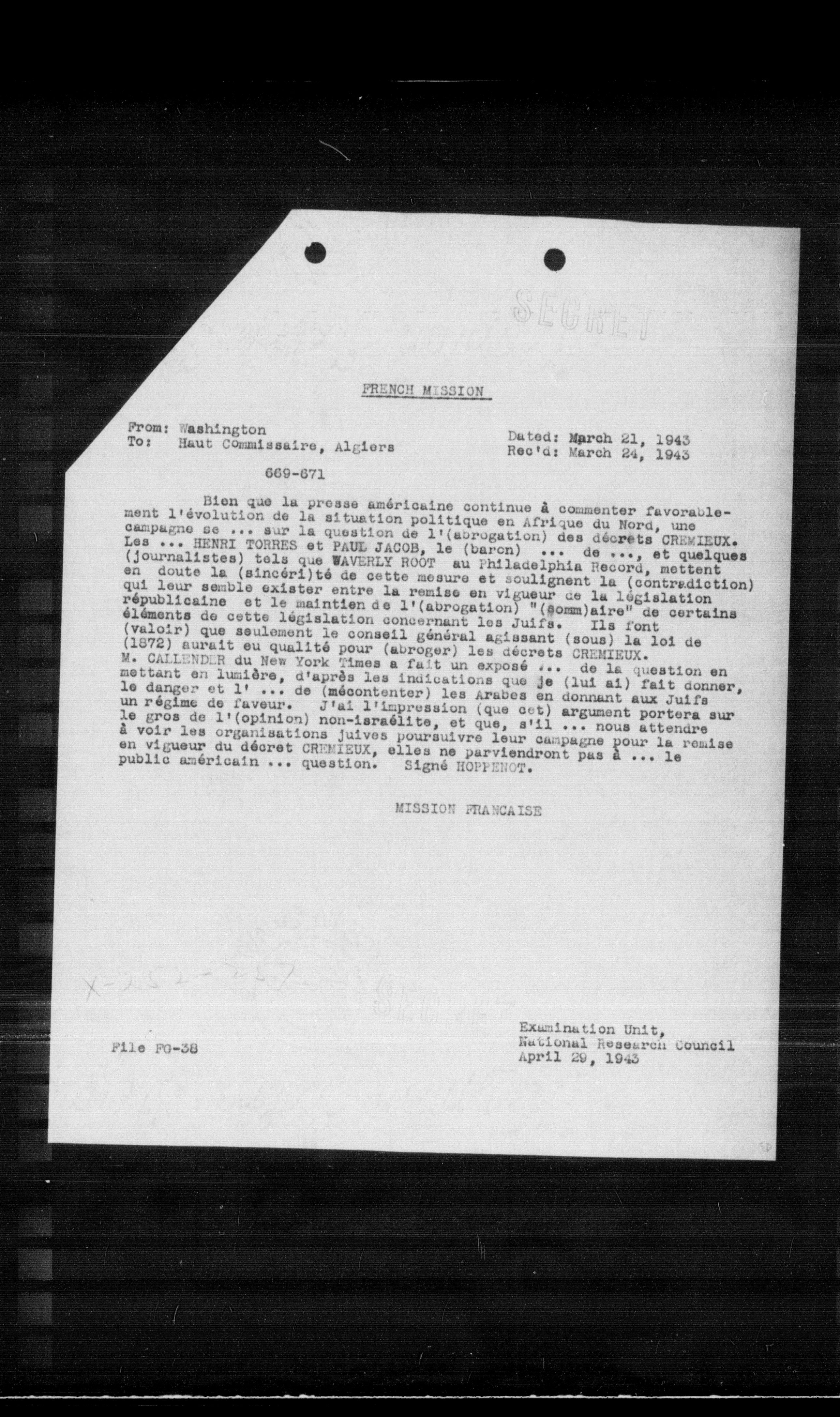 Bien que la presse américaine continue à commenter favorablement l'évolution de la situation politique en Afrique du Nord, une campagne se sur la question de l'(abrogation) des décrets CHEMIEUX. Les HENRI TORRES et PAUL JACOB, le (baron) de et quelques (journalistes) tels que WAVERLY ROOT au Philadelphia Record, mettent en doute la (sincérité de cette mesure et soulignent la (contradiction) qui leur semble exister entre la remise en vigueur de la législation républicaine et le maintien de l'(abrogation) "(comm)aire" de certains éléments de cette législation concernant les Juifs. Ils font (valoir) que seulement le conseil général agissant (sous) la loi de (1872) aurait eu qualité pour (abroger) les décrets CHEMIEUX. M. CALLENECK du New York Times a fait un exposé de la question en mettant en lumière, d'après les indications que je (lui ai) fait donner, le danger et l' de (mécontenter) les Arabes en donnant aux Juifs un régime de faveur. J'ai l'impression (que cet) argument portera sur le gros de l'(opinion) non-israélien, et que, s'il nous attendre à voir les organisations juives poursuivre leur campagne pour la remise en vigueur du décret CHEMIEUX, elles ne parviendront pas à le public américain question. Signé HOFFMANN.