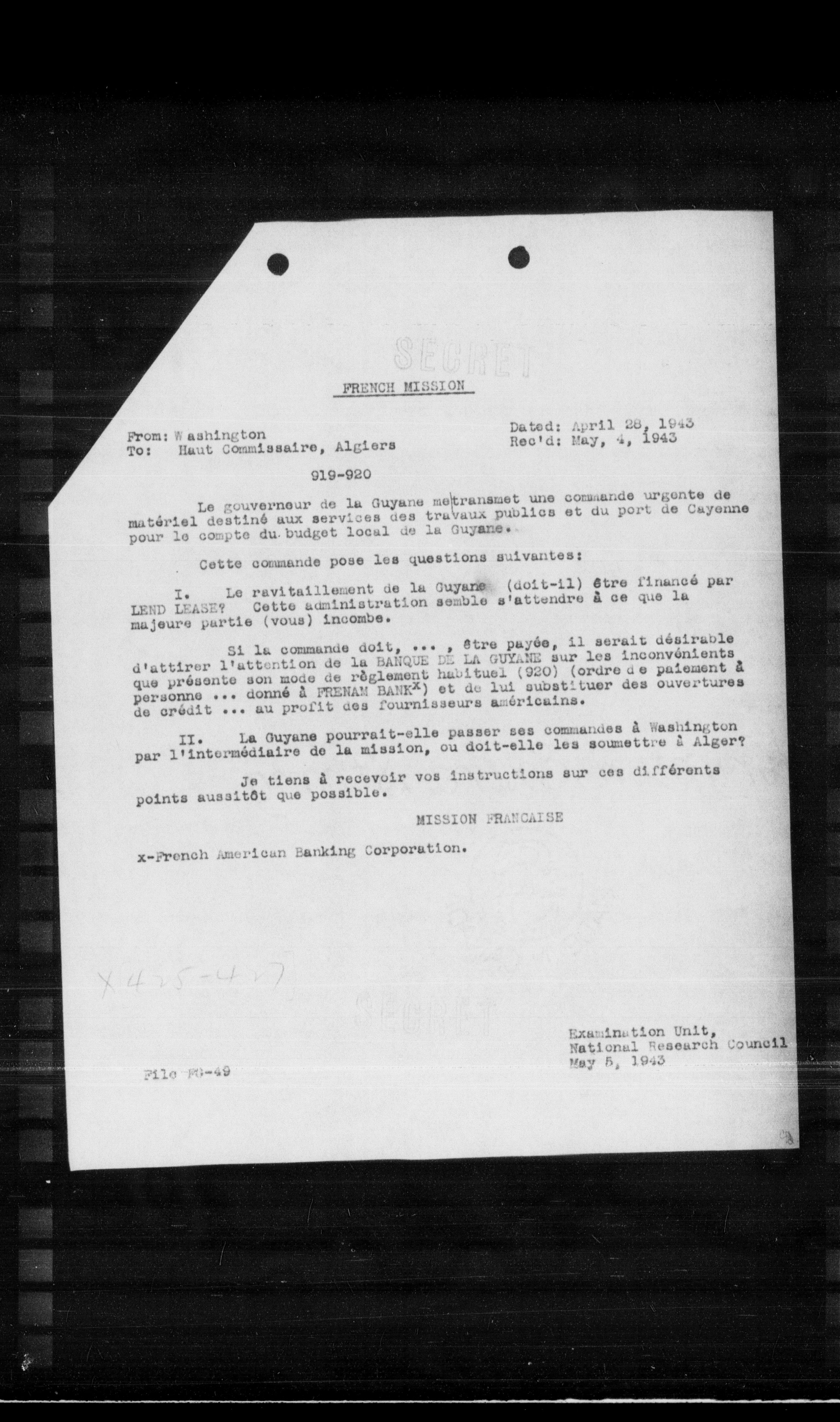 II. La Gujane pourrait-elle passer ses commandes a Washington par l'intermédiaire de la mission, ou doit-elle les soumettre a Alger?