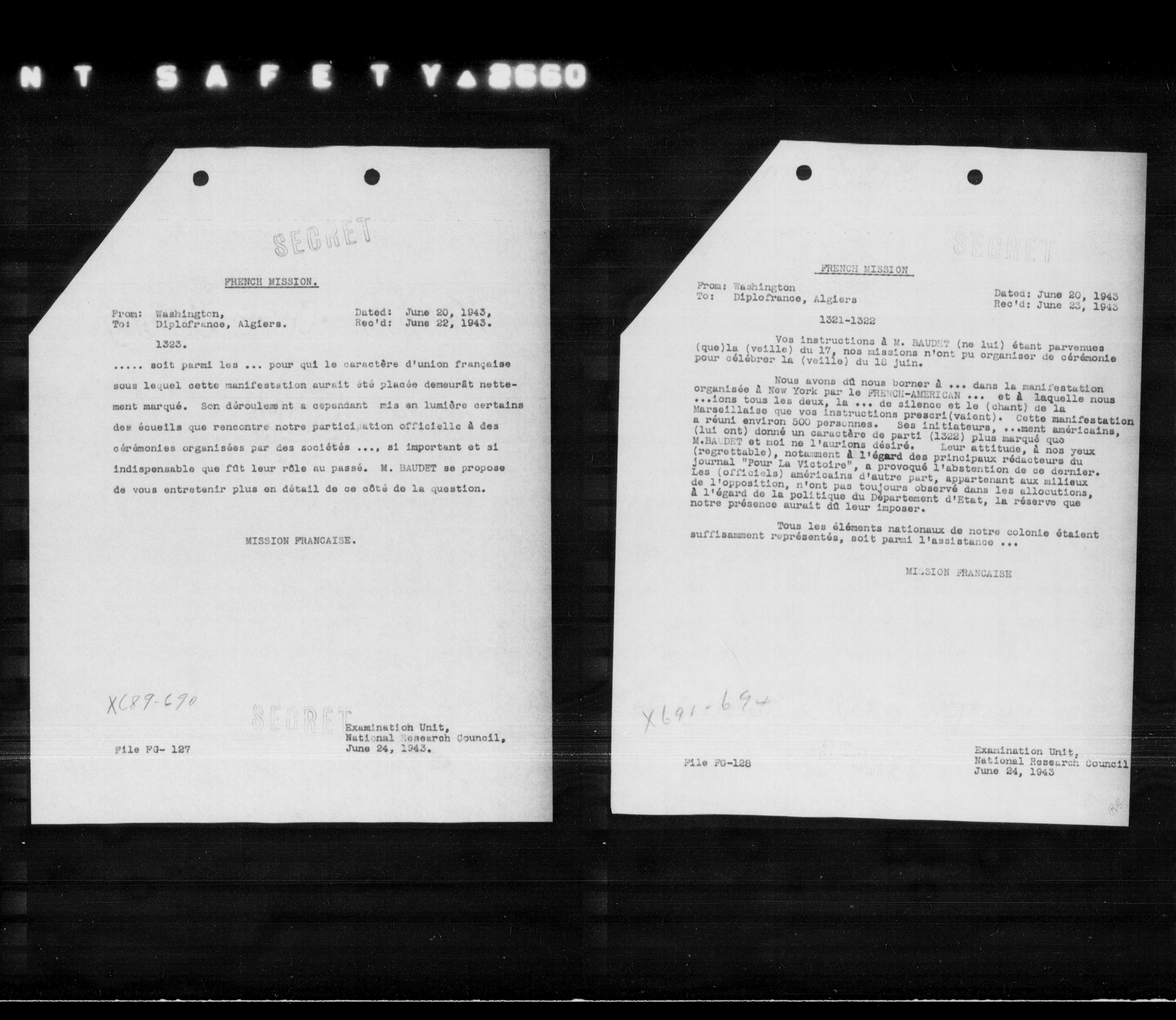 Nous avons dû nous borner à ... dans la manifestation organisée à New York par le FRENCH-ANERICAN ... et à laquelle nous ... nous tous les deux, la ... de silence et le (chant) de la ... Marseillaise que vos instructions prescri[vaient). Cette manifestation a réuni environ 500 personnes. Ses initiateurs, ...ment américains, (lui ont) donné un caractère de parti (1322) plus marqué que M. BAUDET et moi ne l'aurions désiré. Leur attitude, à nos yeux (regrettable), notamment à l'égard des principaux rédacteurs du journal "Pour La Histoire", a provoqué l'abstention de ce dernier. Les (officiels) américains d'autre part, appartenant aux milieux de l'opposition, n'ont pas toujours observé dans les allocations, à l'égard de la politique du Département d'Etat, la réserve que notre présence aurait dû leur imposer.
