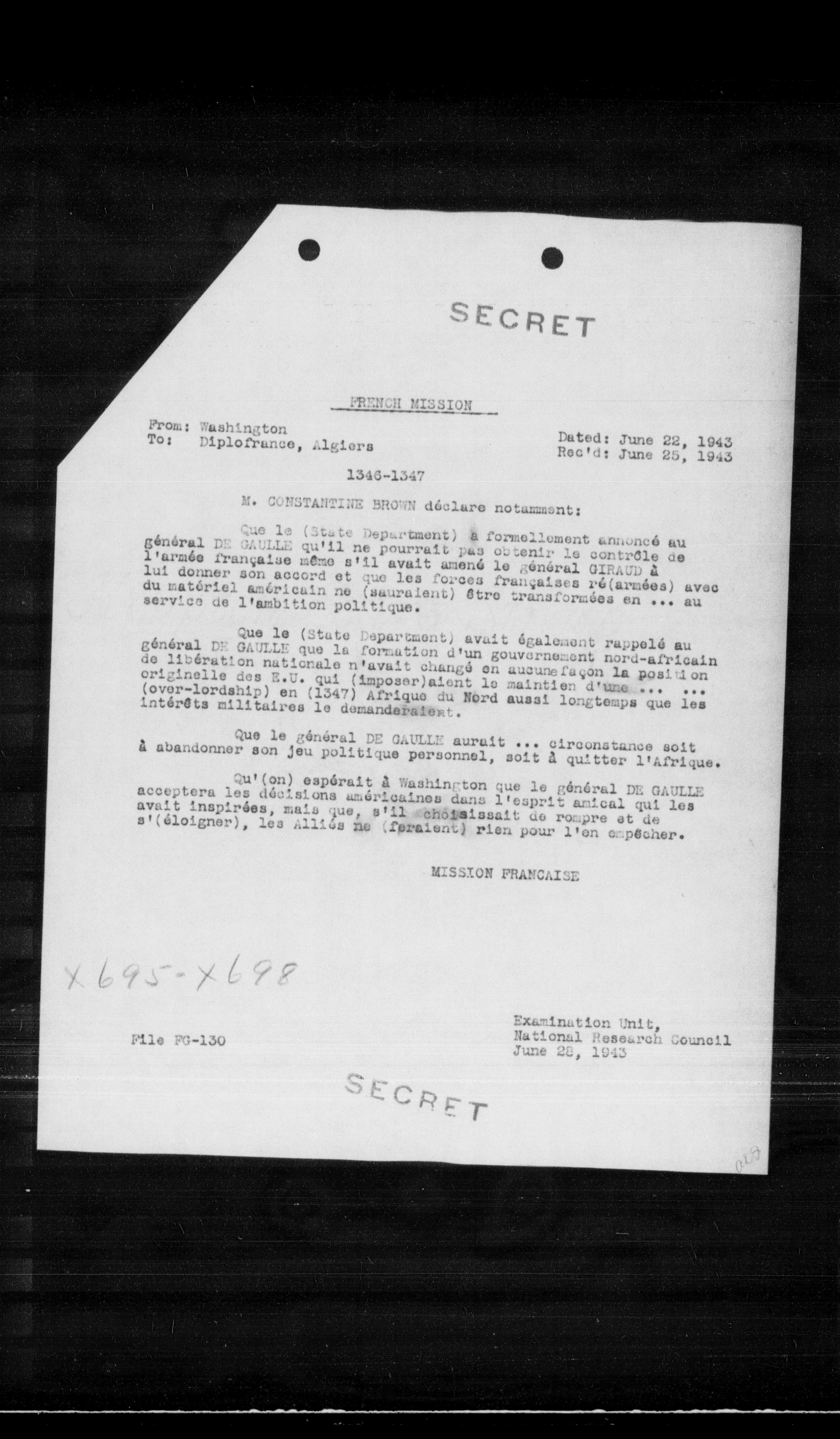 Que le (State Department) a formellement annoncé au général DE GAULLE qu'il ne pourrait pas obtenir le contrôle de l'armée française même s'il avait amené le général GIRAUD à lui donner son accord et que les forces françaises ré(armées) avec du matériel américain ne (sauraient) être transformées en au service de l'ambition politique.