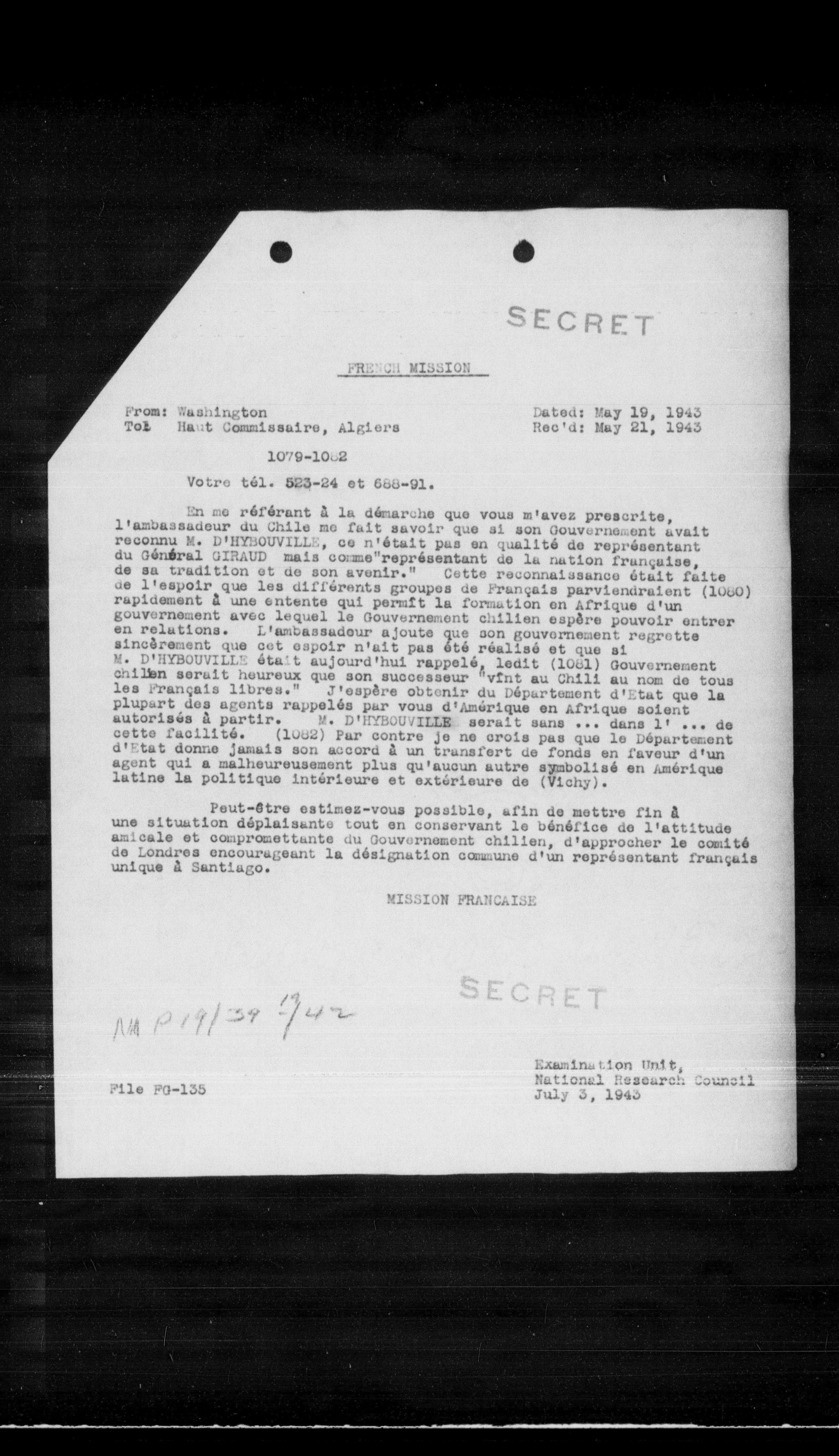 En me référant à la démarche que vous m'avez prescrite, l'ambassadeur du Chile me fait savoir que si son Gouvernement avait reconnu M. D'HYBOUVILLE, ce n'était pas en qualité de représentant du Général GIRAUD mais comme "représentant de la nation française, de sa tradition et de son avenir." Cette reconnaissance était faite de l'espoir que les différents groupes de Français parviendraient (1000) rapidement à une entente qui pernît la formation en Afrique d'un gouvernement avec lequel le Gouvernement chilien espère pouvoir entrer en relations. L'ambassadeur ajoute que son gouvernement regrette sincèrement que cet espoir n'ait pas été réalisé et que si