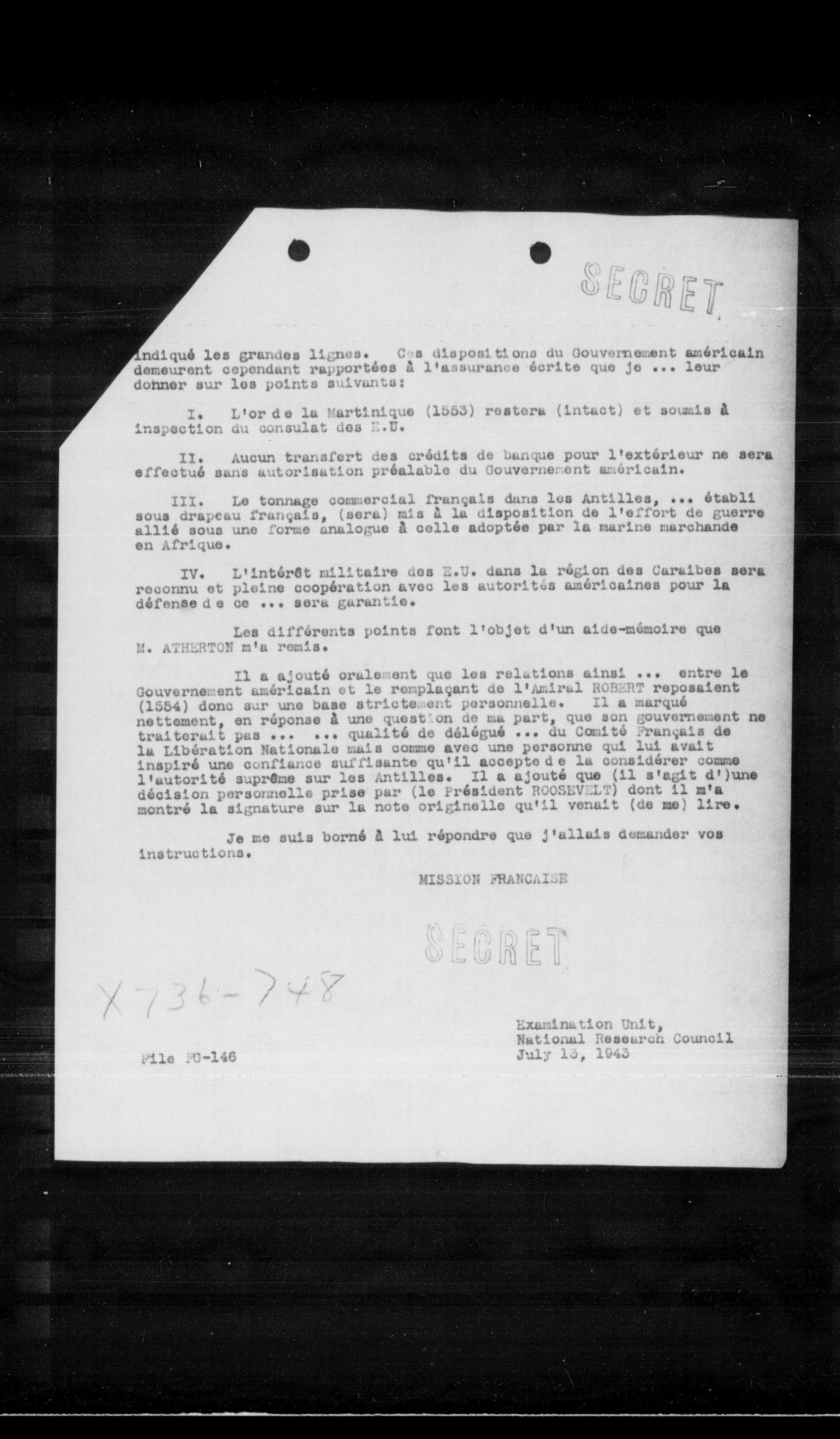 Il a ajouté oralement que les relations ainsi ... entre le Gouvernement américain et le remplaçant de l'Amiral ROBERT reposaient (1554) donc sur une base strictement personnelle. Il a marqué nettement, en réponse à une question de ma part, que son gouvernement ne traiterait pas ... ... qualité de délégué ... du Comité Français de la Libération Nationale mais comme avec une personne qui lui avait inspiré une confiance suffisante qu'il accepte de la considérer comme l'autorité suprême sur les Antilles. Il a ajouté que (il s'agit d')une décision personnelle prise par (le Président ROOSEVELT) dont il m'a montré la signature sur la note originelle qu'il venait (de me) lire.