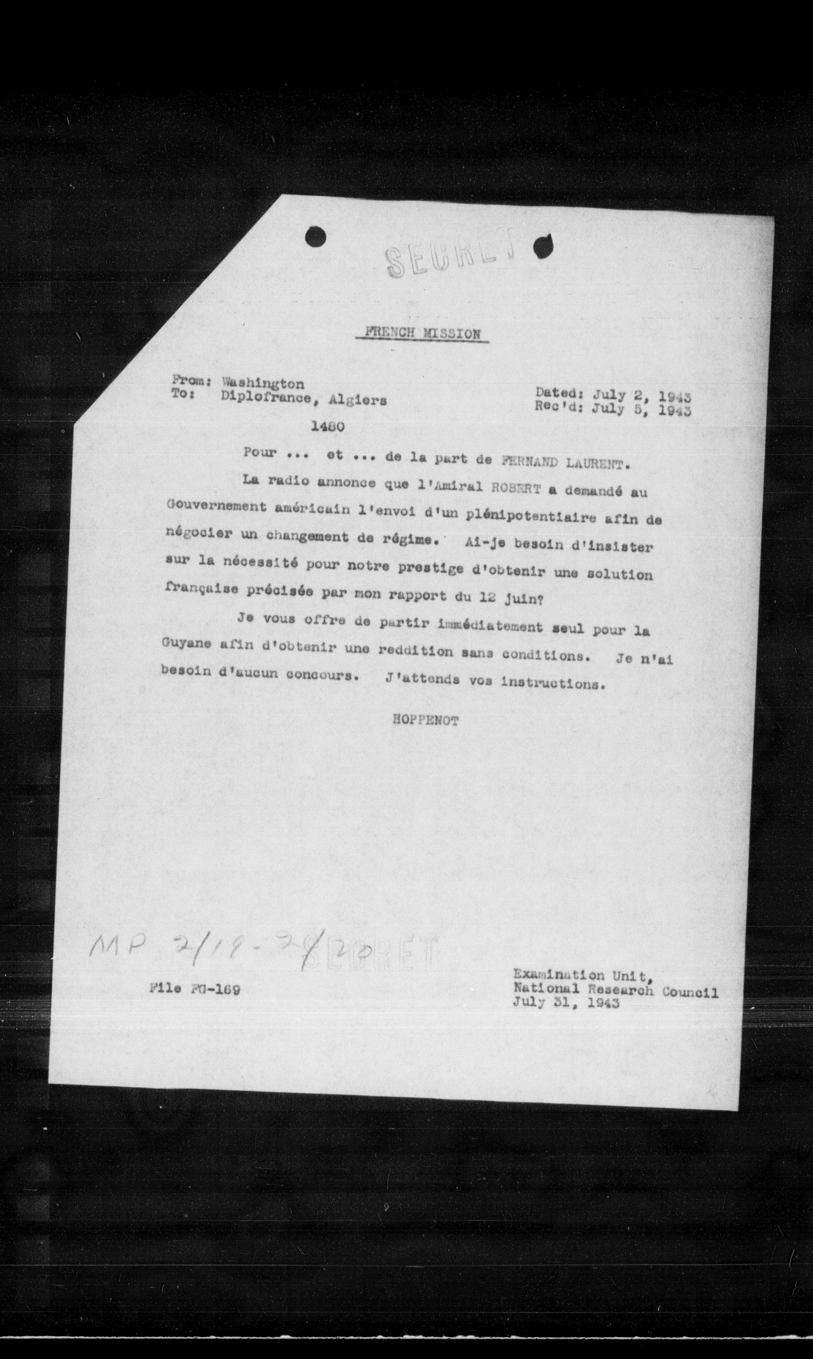 La radio annonce que l'Amiral ROBERT a demandé au Gouvernement américain l'envoi d'un plénipotentiaire afin de négocier un changement de régime. Ai-je besoin d'insister sur la nécessité pour notre prestige d'obtenir une solution française précisée par mon rapport du 12 juin?