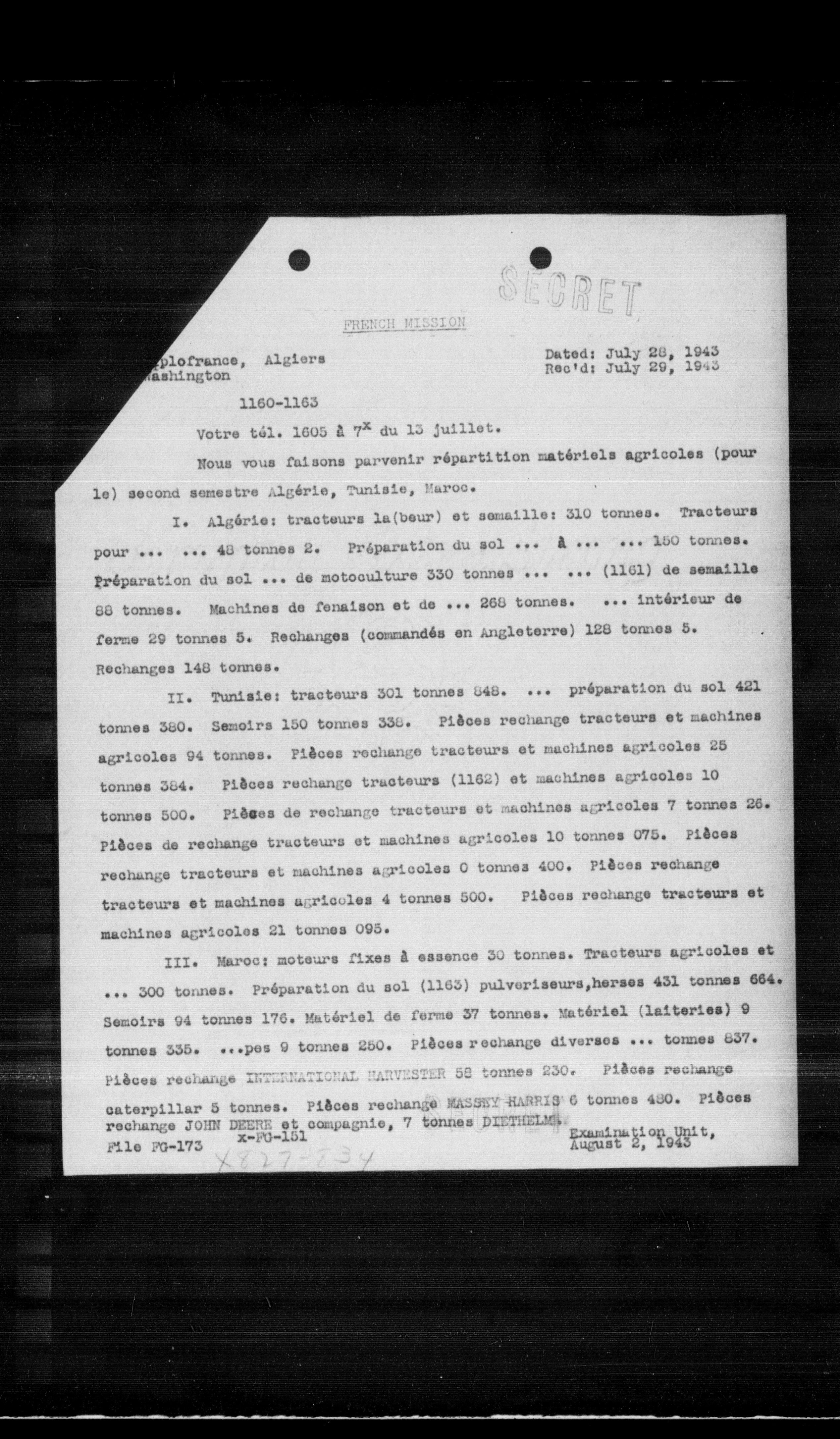 Nous vous faisons parvenir répartition matériels agricoles (pour le) second semestre Algérie, Tunisie, Maroc.