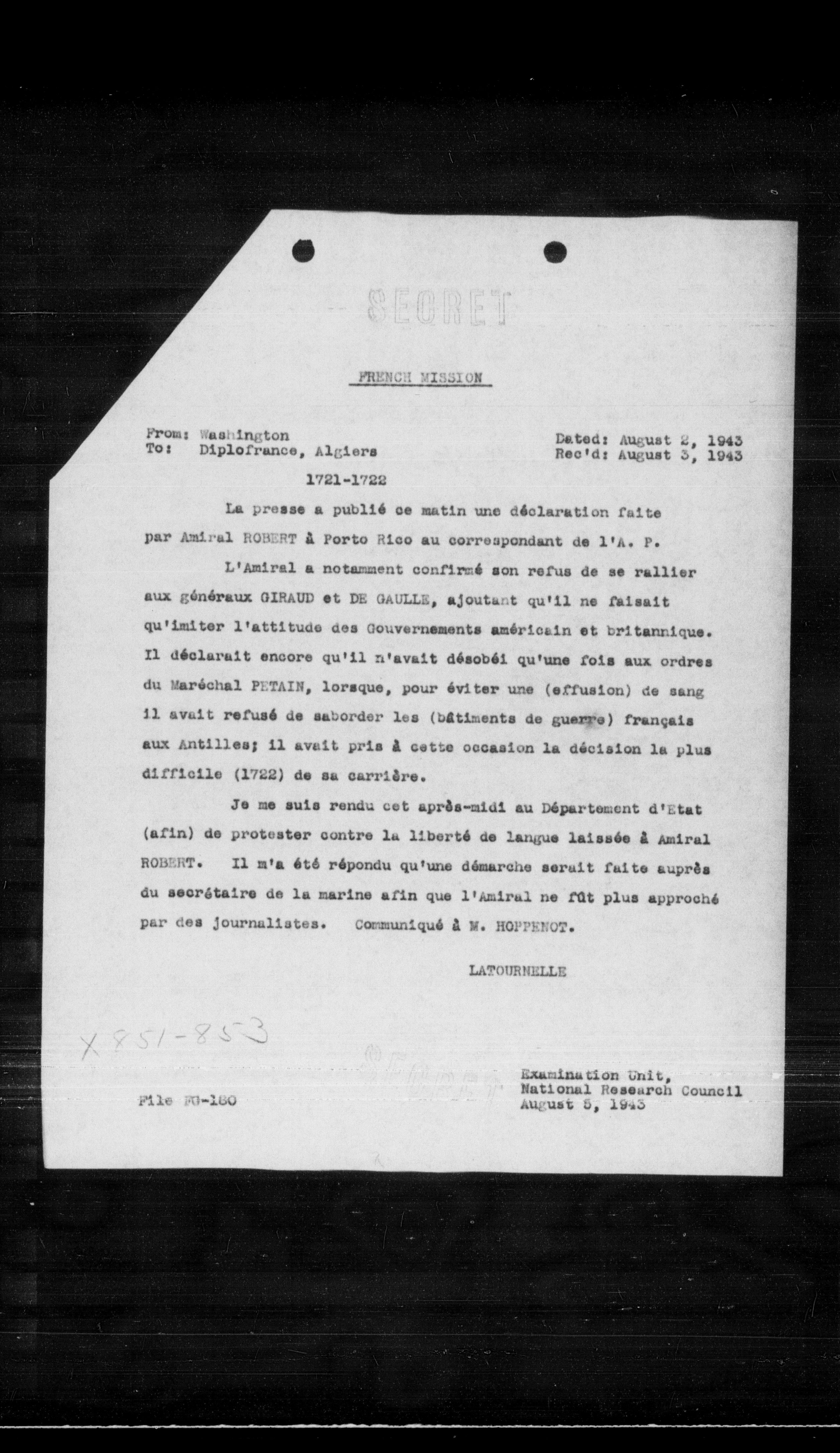 L'Amiral a notamment confime son refus de se rallier aux généraux GIRAUD et DE GAULLE, ajoutant qu'il ne faisait qu'imiter l'attitude des Gouvernements américain et britanrique. Il déclarait encore qu'il n'avait désobéi qu'une fois aux ordres du Maréchal PETAIN, lorsque, pour éviter une (effusion) de sang il avait refusé de saborder les (bâtiments de guerre) frangais aux Antilles; il avait pris a cette occasion la décision la plus difficile (1722) de sa carrière.