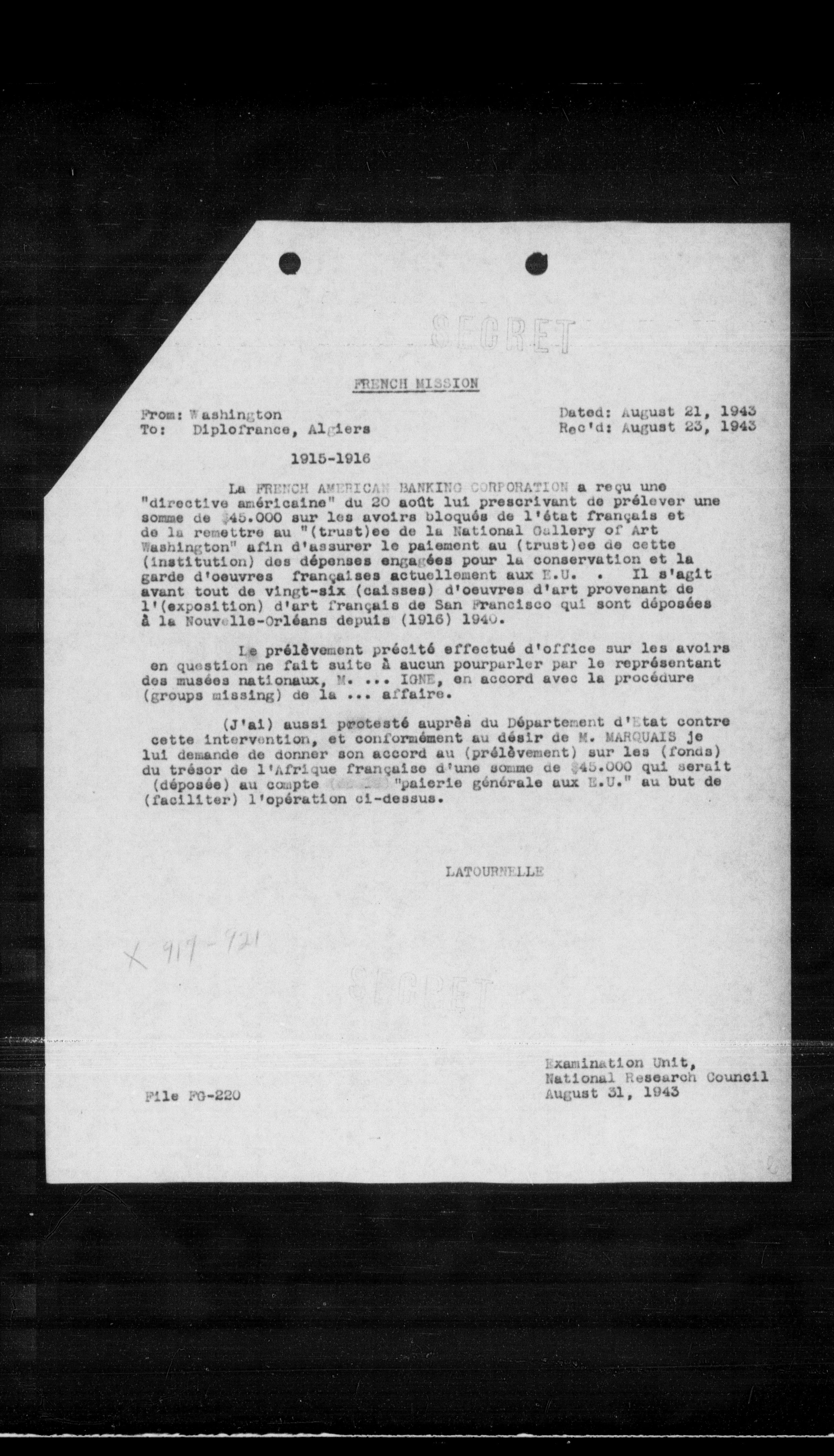 La FRENCH AMERICAN BANKING CONFONATION a reçu une "directive anéricaine" du 20 août lui prescrivant de prélever une somme de $\$ 45.000$ sur les avoirs bloqués de l'état français et de la remettre au "(trust)ee de la National Gallery of Art Washington" afin d'assurer le patement au (trust)ee de cette (institution) des dépenses engagées pour la conservation et la garde d'oeuvres françaises actuellement aux E.U. . Il s'agit avant tout de vingt-six (caisses) d'oeuvres d'art provenant de l'(exposition) d'art français de San Francisco qui sont déposées a la Nouvelle-Orléans depuis (1916) 1940.