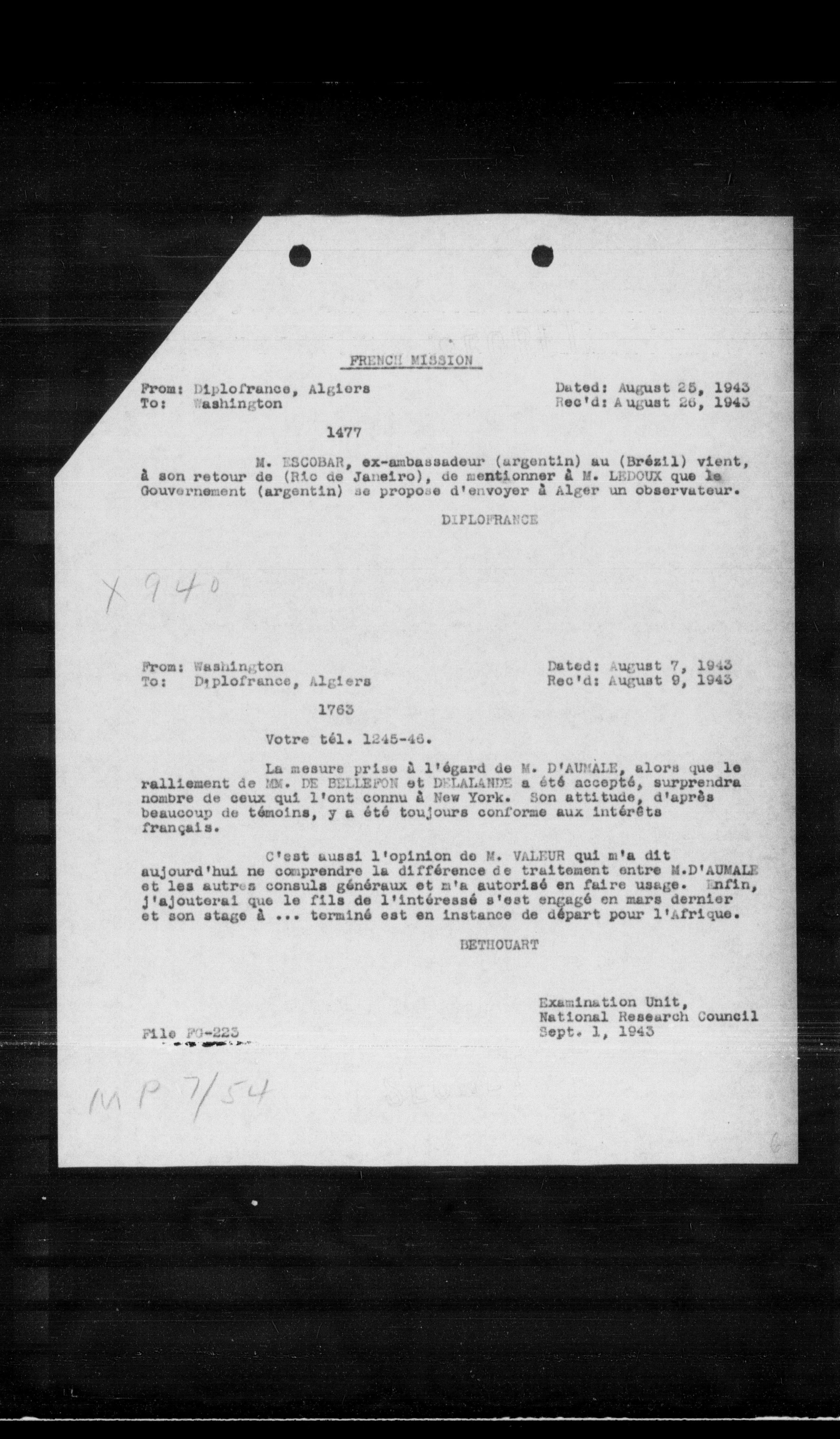 La mesure prise à l'égard de M. D'AUNALE, alors que le ralliement de M. DE BELLEFOR et DELALANDE a été accepté, surprendra nombre de ceux qui l'ont connu à New York. Son attitude, d'après beaucoup de témoins, y a été toujours conforme aux intérêts français.