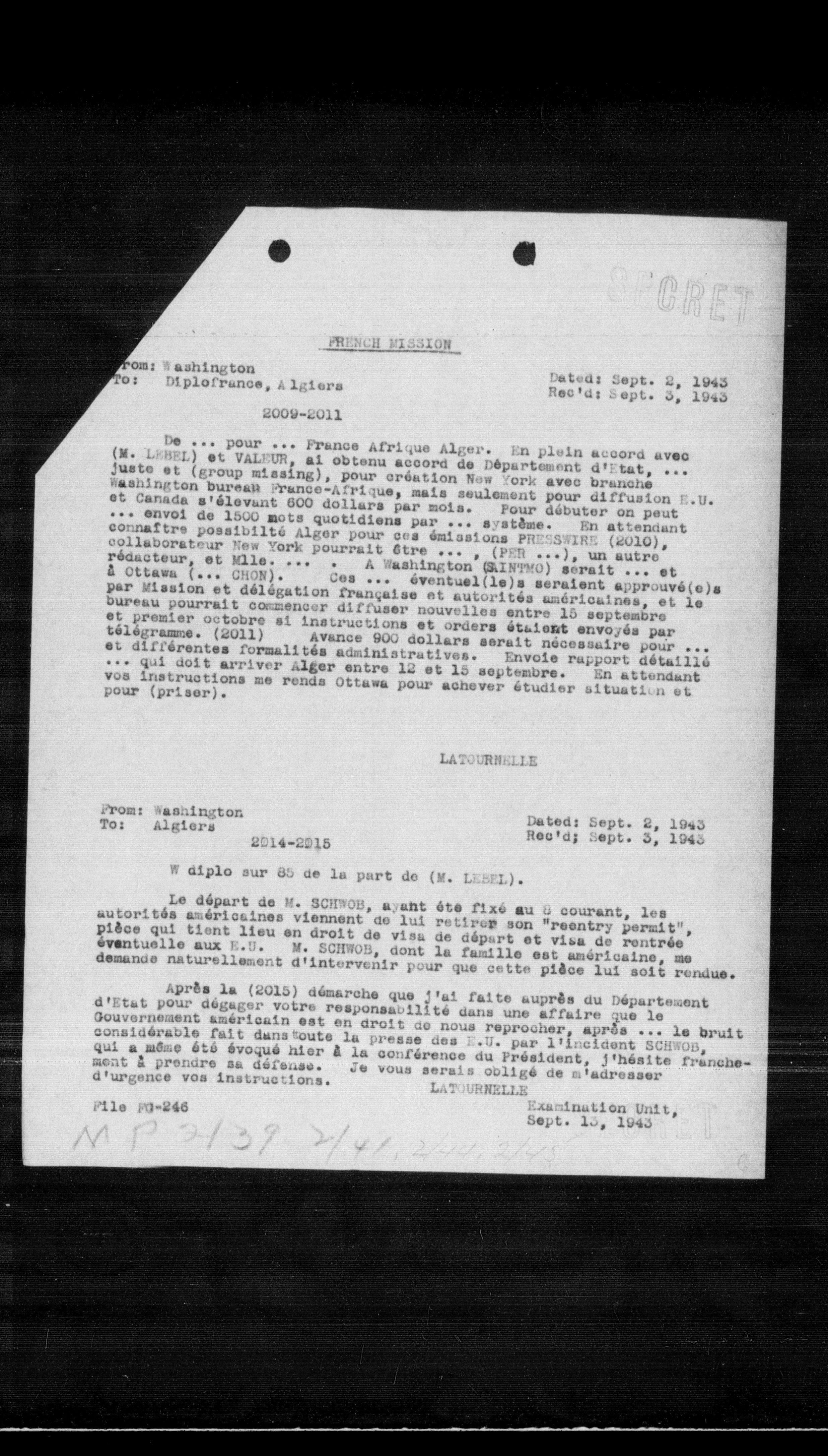 De ... pour ... France Afrique Alger. En plein accord avec (M. LEMEL) et YALEUN, al obtenu accord de Département d'Etat, ... juste et (group missing), pour création New York avec branche Washington bureau France-Airique, mais seulement pour diffusion E.U. et Canada s'élevant 800 dollars par mois. Pour débuter on peut ... envoi de 1500 mots quotidiens par ... système. En attendant connaître possibilité Alger pour ces émissions PRESSWIRE (2010), collaborateur New York pourrait être ... , (PER ...), un autre rédacteur, et Mlle. . . . A Washington (KINTRO) serait ... et a Ottawa (... CHON). Ces ... éventuel(le)s seraient approuvé(e)s par Mission et délégation française et autorités américaines, et le bureau pourrait commencer diffuser nouvelles entre 15 septembre et premier octobre si instructions et orders étaient envoyés par télégramme. (2011) Avance 900 dollars serait nécessaire pour ... et différentes formalités administratives. Envoie rapport détaillé ... qui doit arriver Alger entre 12 et 15 septembre. En attendant vos instructions me rends Ottawa pour achever étudier situation et pour (priser).