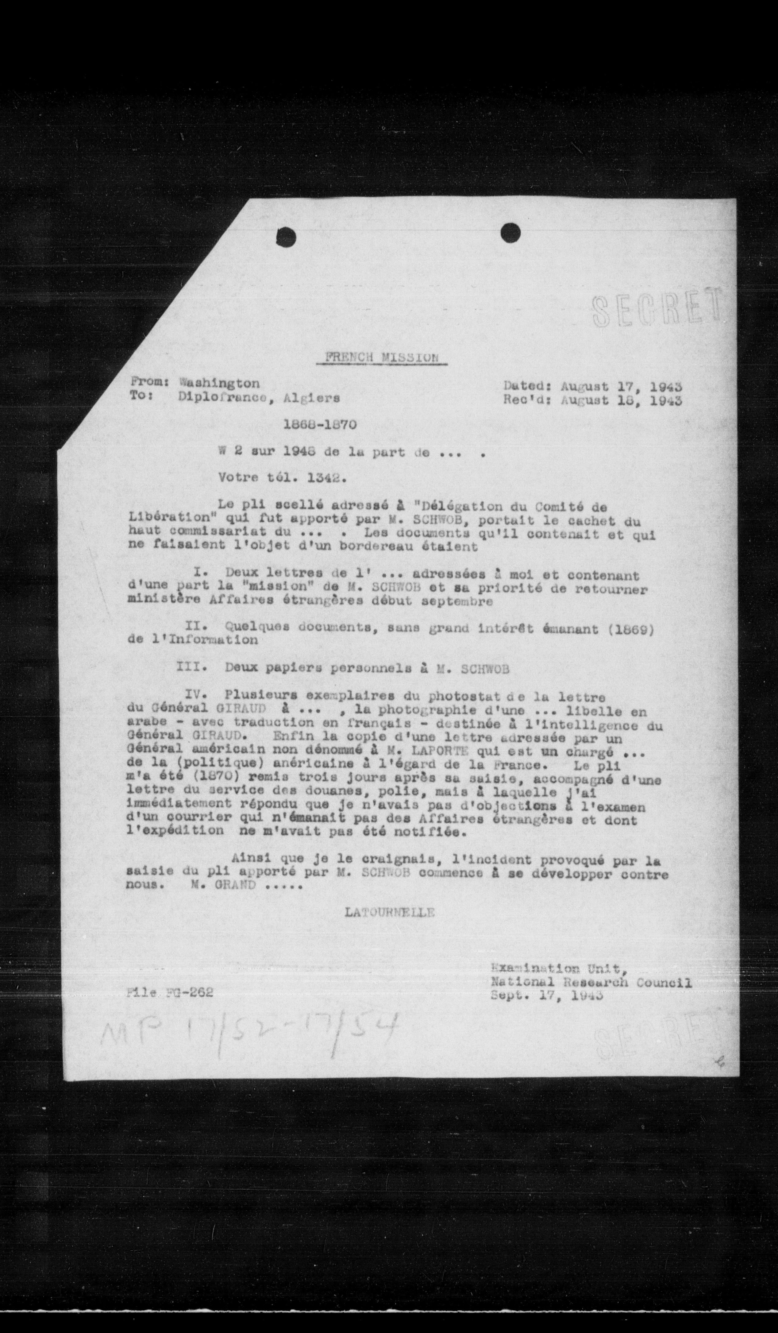 IV. Plusieurs exemplaires du photostat de la lettre du Général GIRADD a ... , la photographie d'une ... libelle en arabe - avec traduction en français - destinée a l'intelligence du Général GIRADD. Enfin la copie d'une lettre adressée par un Général américain non dénommé a M. LAFORTE qui est un charge ... de la (politique) anéricaine a l'égard de la France. Le pli m'a été (1870) remis trois jours après sa saisie, ascompagné d'une lettre du service des douanes, polie, mais a laquelle j'ai immédiatement répondu que je n'avais pas d'objections a l'examen d'un courrier qui n'émanait pas des Affaires étrangères et dont l'expédition ne m'avait pas été notifiée.
