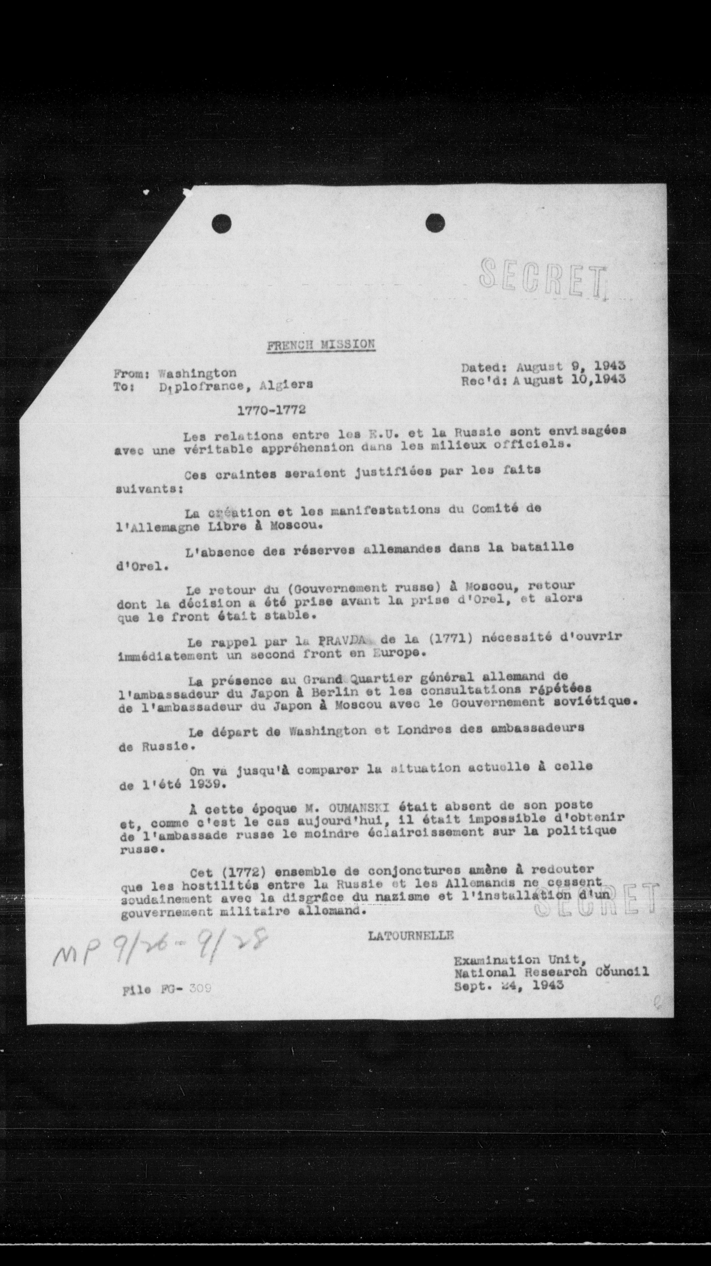 - La présence au Grand Quartier général allemand de l'ambassadeur du Japon à Berlin et les consultations répétées de l'ambassadeur du Japon à Moscou avec le Gouvernement soviétique.