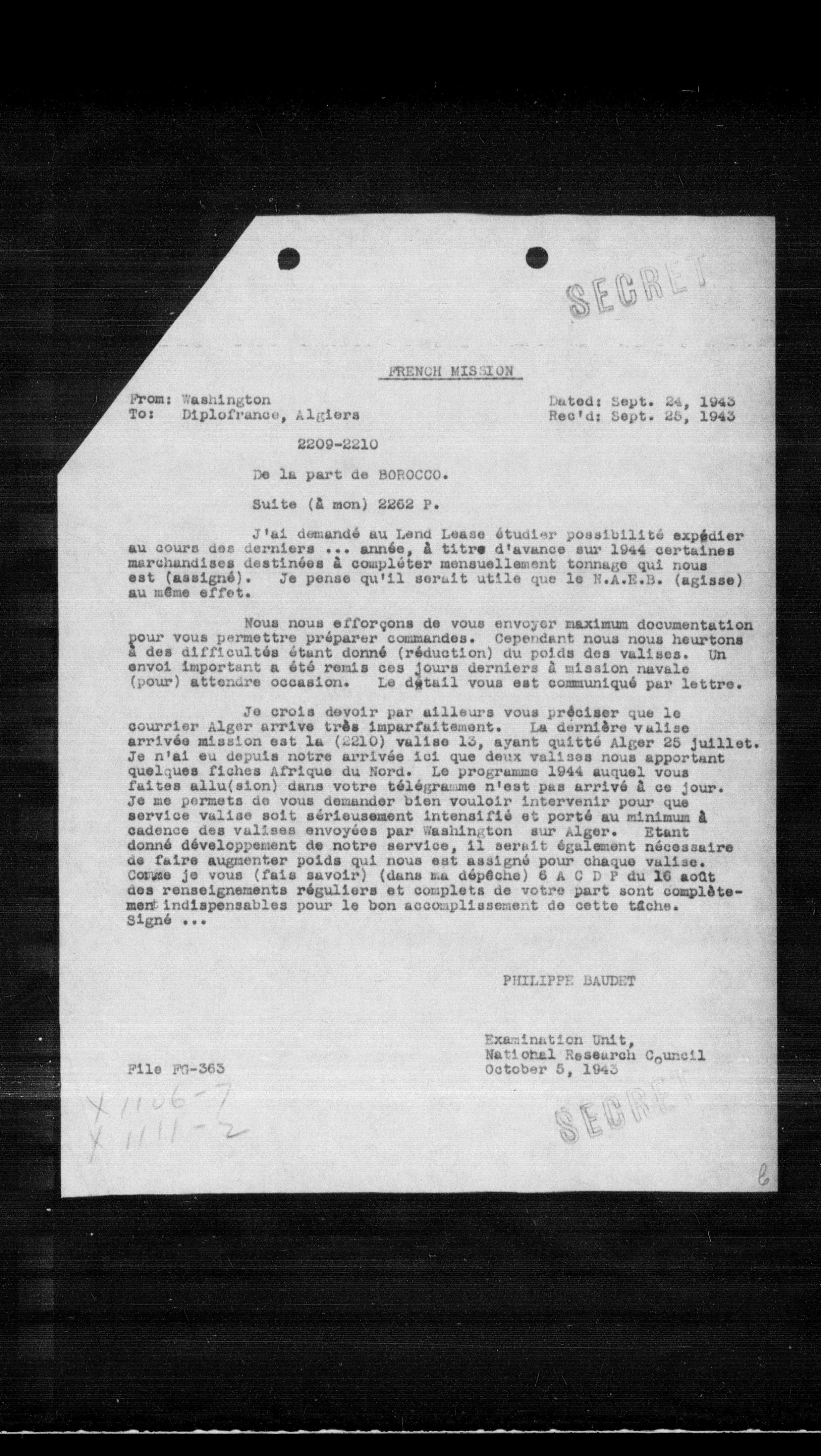 Je crois devoir par ailleurs vous préciser que le courrier Alger arrive très imparfaitement. La dernière valise arrivée mission est la (2210) valise 13, ayant quitté Alger 25 juillet. Je n'ai eu depuis notre arrivée ici que deux valises nous apportant quelques fiches Afrique du Nord. Le programme 1944 auquel vous faites allu(sion) dans votre télégramme n'est pas arrivé a ce jour. Je me permets de vous demander bien vouloir intervenir pour que service valise soit sérieusement intensifié et porté au minimum a cadence des valises envoyées par Washington sur Alger. Etant donné développement de notre service, il serait également nécessaire de faire augmenter poids qui nous est assigné pour chaque valise. Comme je vous (fais savoir) (dans ma dépêche) 6 A C D P du 16 août des renseignements réguliers et complets de votre part sont complètement indispensables pour le bon accomplissement de cette tâche. Signé ...