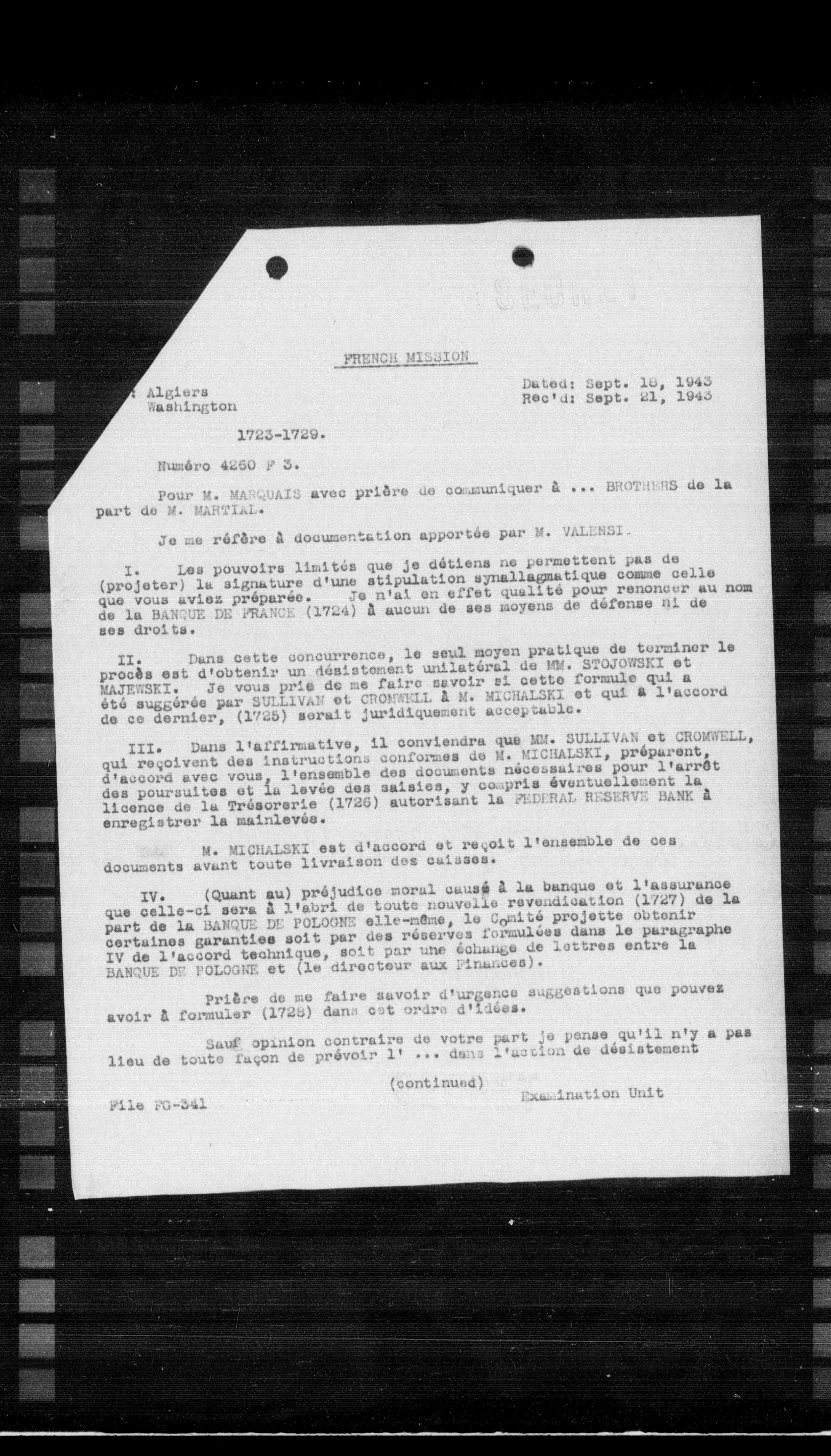 III. Dans l'affirmative, il conviendra que MM. SULLIVAN et CROMWELL, qui reçoivent des instructions conformes de M. MICHALSKI, préparent, d'accord avec vous, l'ensemble des documents nécessaires pour l'arrêt des poursuites et la levée des saisies, y compris éventuellement la licence de la Trésorerie (1726) autorisant la FEDERAL RESERVE BANK à enregistrer la mainlevée.