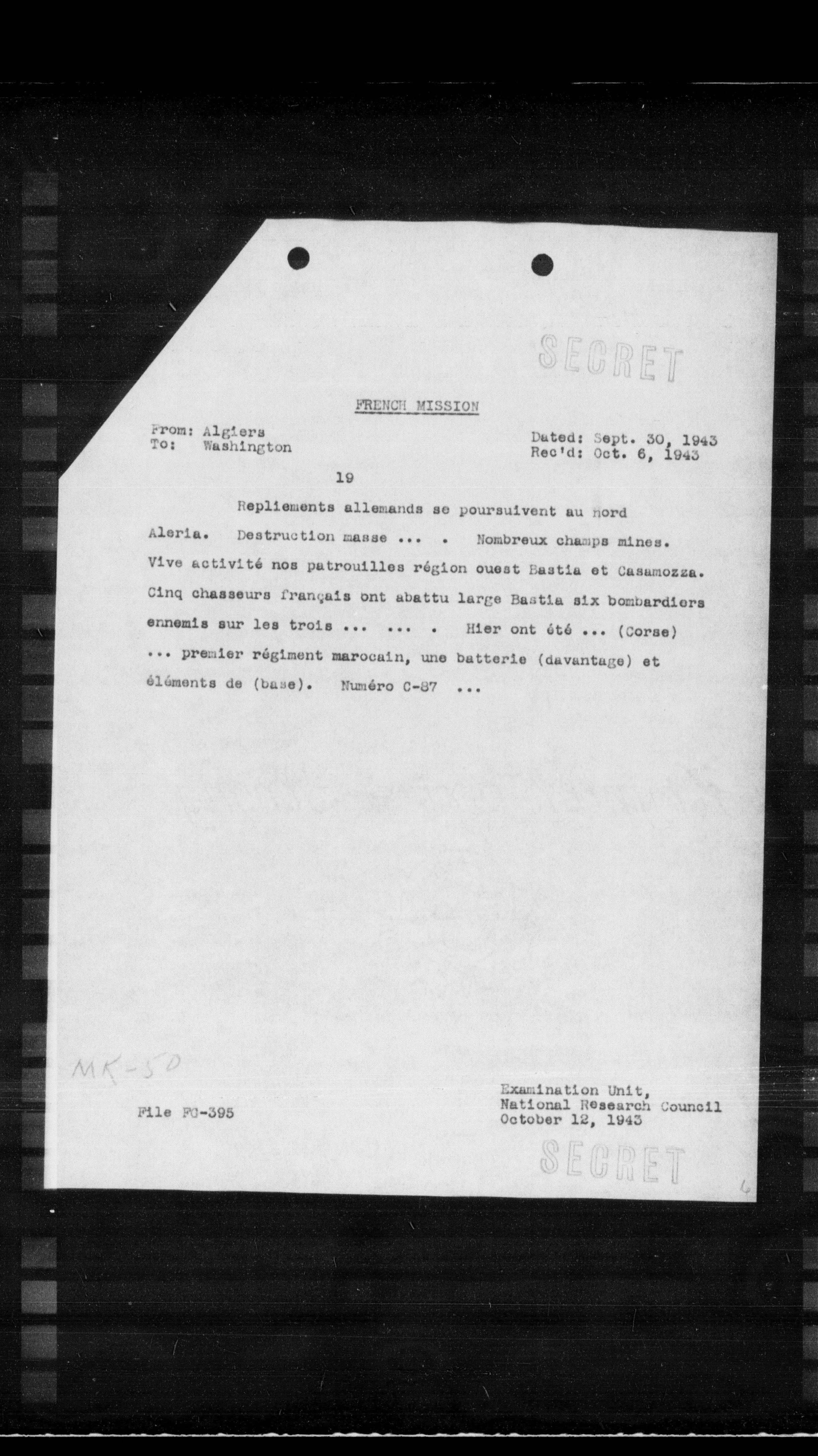 Aleria. Destruction masse ... . Nombreux champs mines. Vive activité nos patrouilles région ouest Bastia et Casamozza. Cinq chasseurs français ont abattu large Bastia six bombardiers ennemis sur les trois ... ... . Hier ont été ... (Corse) ... premier régiment marocain, une batterie (davantage) et éléments de (base). Numéro C-87 ...