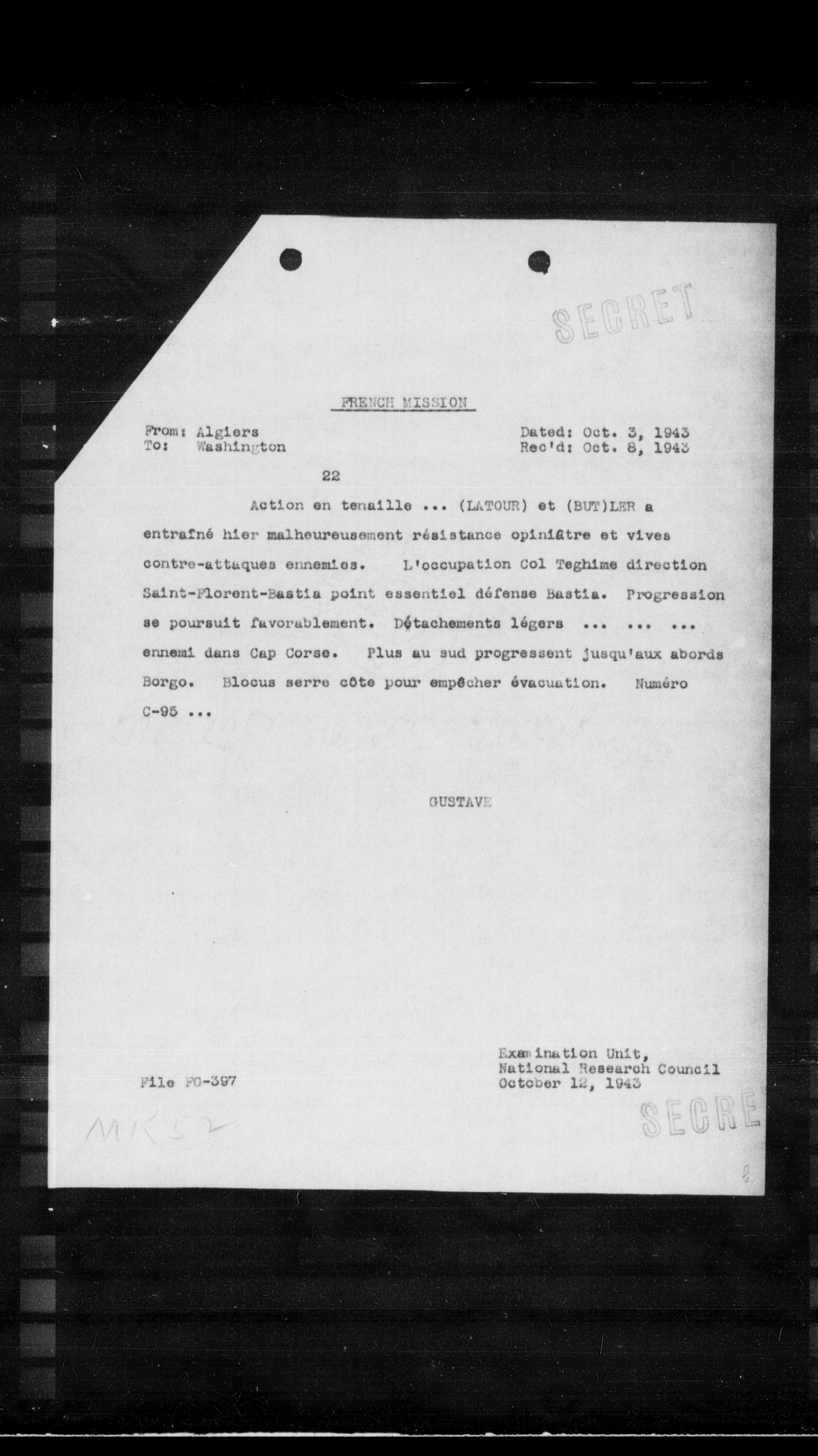entrafné hier malheureusement résistance opiniâtre et vives contre-attaques ennemies. L'occupation Col Teghime direction Saint-Florent-Bastia point essentiel défense Bastia. Progression se poursuit favorablement. Détachements légers ......... ennemi dans Cap Corse. Plus au sud progressent jusqu'aux abords Borgo. Blocus serre côte pour empêcher évacuation. Numéro C-95 ...