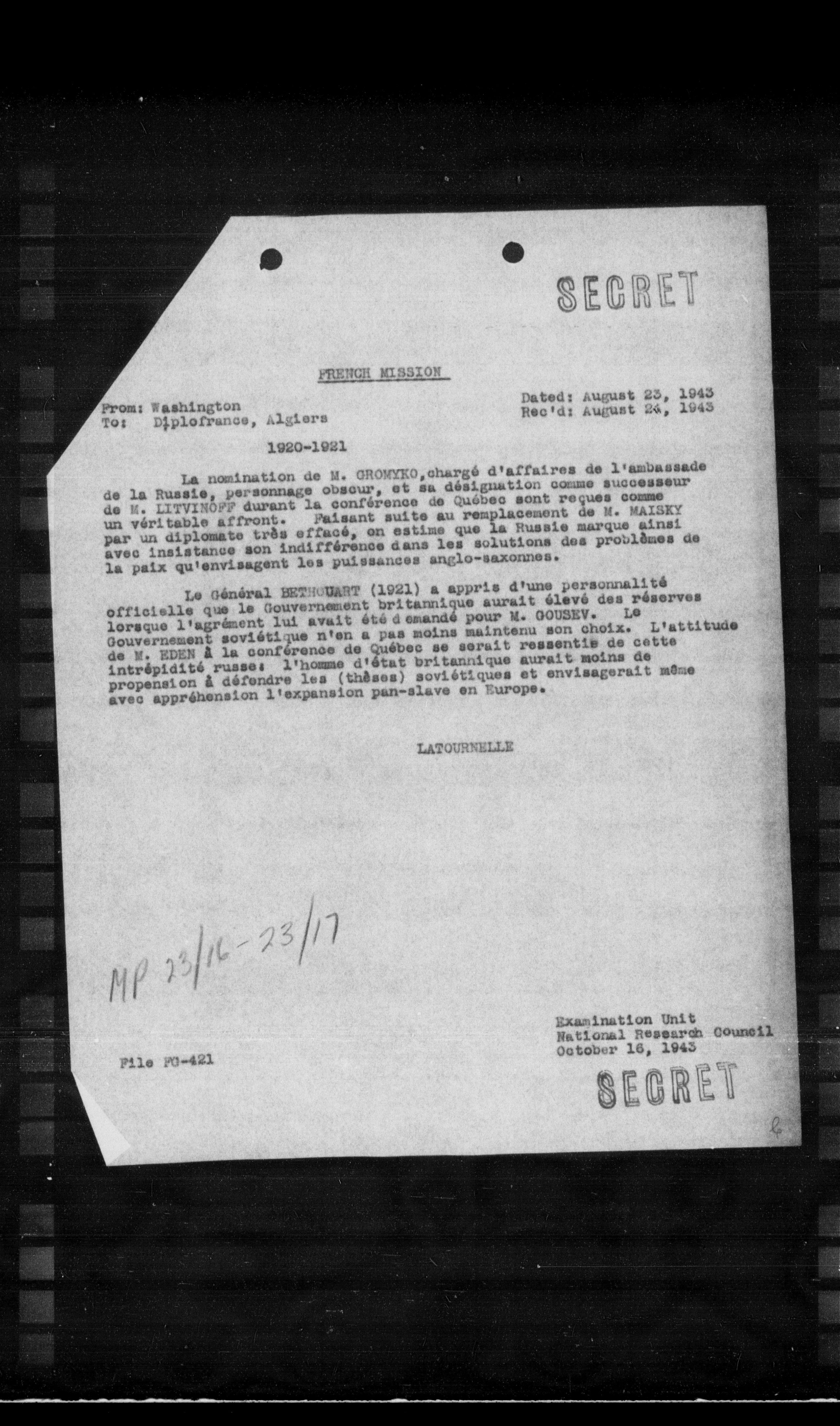 Le Général BETHQUART (1921) a appris d'une personnalité officielle que le Gouvernement britannique aurait élevé des réserves lorsque l'agrément lui avait été demandé pour M. GOUSEV. Le Gouvernement soviétique n'en a pas moins maintenu son choix. L'attitude de M. EDEN a la conférence de Québec se serait ressentie de cette intrépidité russe: l'homme d'état britannique aurait moins de propension à défendre les (thèses) soviétiques et envisagerait même avec appréhension l'expansion pan-slave en Europe.