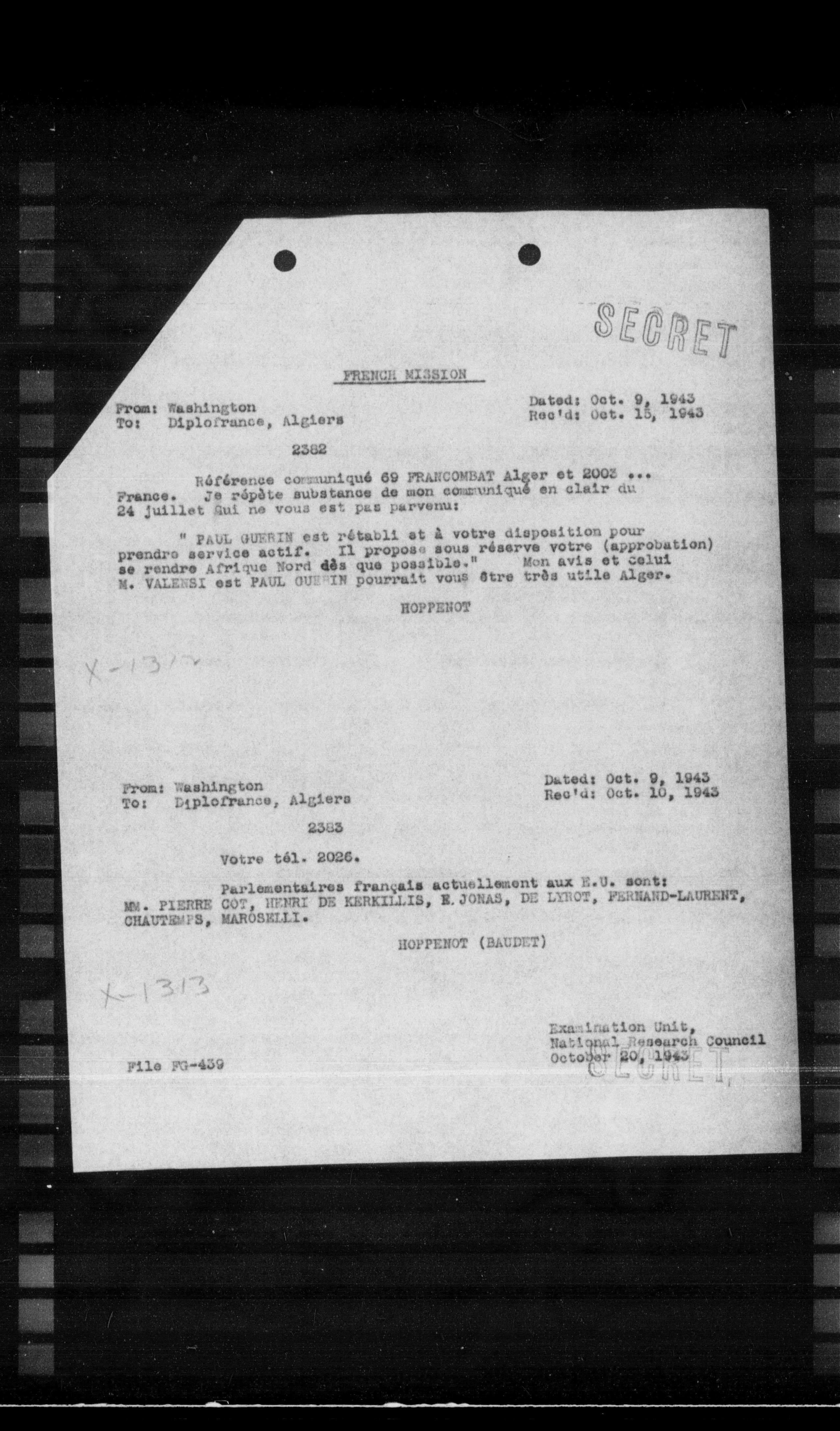 "PAUL GUERIN est rétabli et à votre disposition pour prendre service actif. Il propose sous réserve votre (approbation) se rendre Afrique Nord dès que possible." Mon avis et celui M. VALEESI est PAUL GUERIN pourrait vous être très utile Alger.