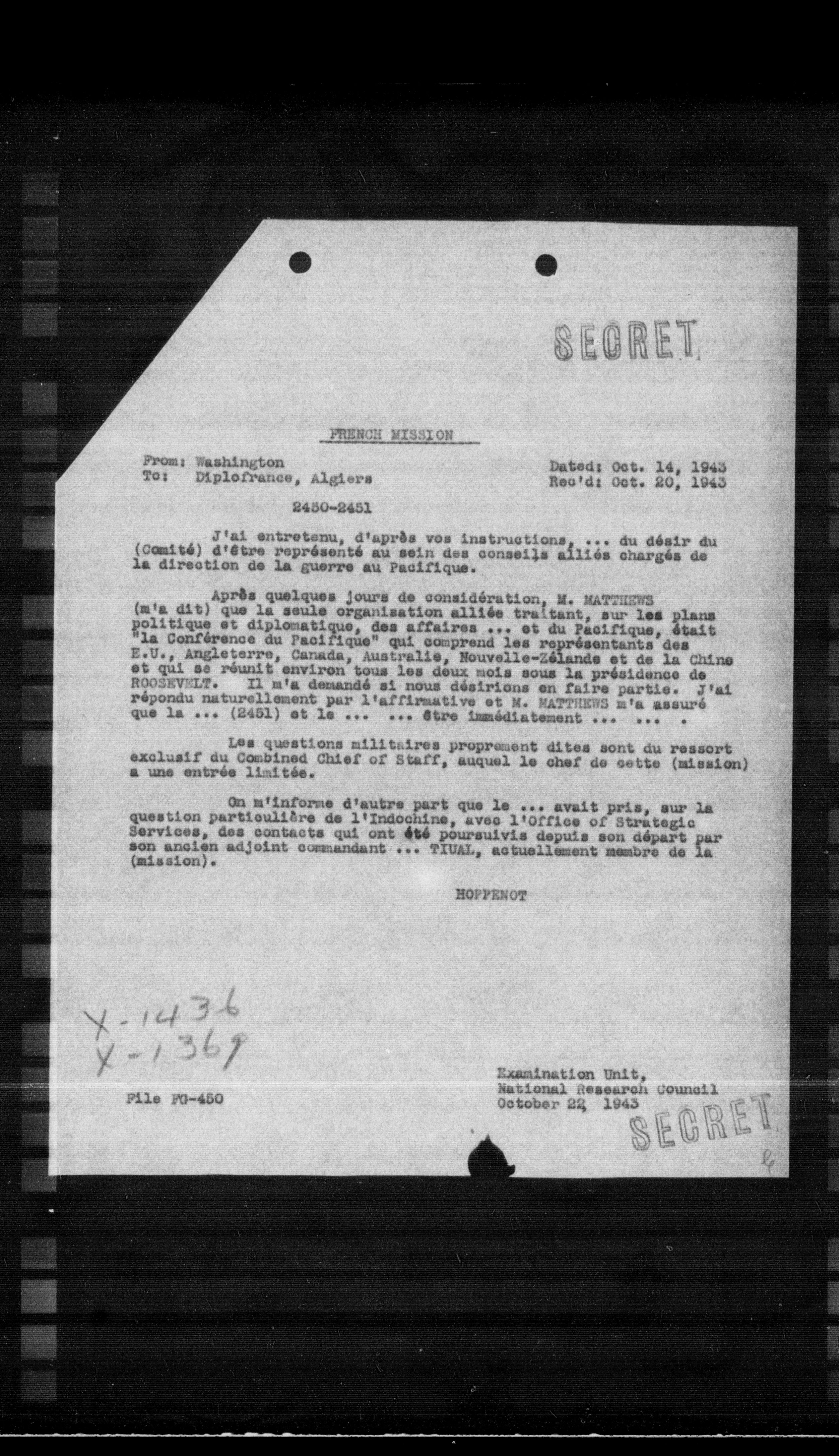 Après quelques jours de considération, M. MATTHEWS (m'a dit) que la seule organisation alliée traitant, sur les plans politique et diplomatique, des affaires ... et du Pacifique, était "la Conférence du Pacifique" qui comprend les représentants des E.U., Angleterre, Canada, Australie, Nouvelle-Zélande et de la Chine et qui se réunit environ tous les deux mois sous la présidence de ROOSEVELT. Il m'a demandé si nous désirions en faire partie. J'ai répondu naturellement par l'affirmative et M. MATTHEWS m'a assuré que la ... (2451) et le ... ... être immédiatement ... . . .