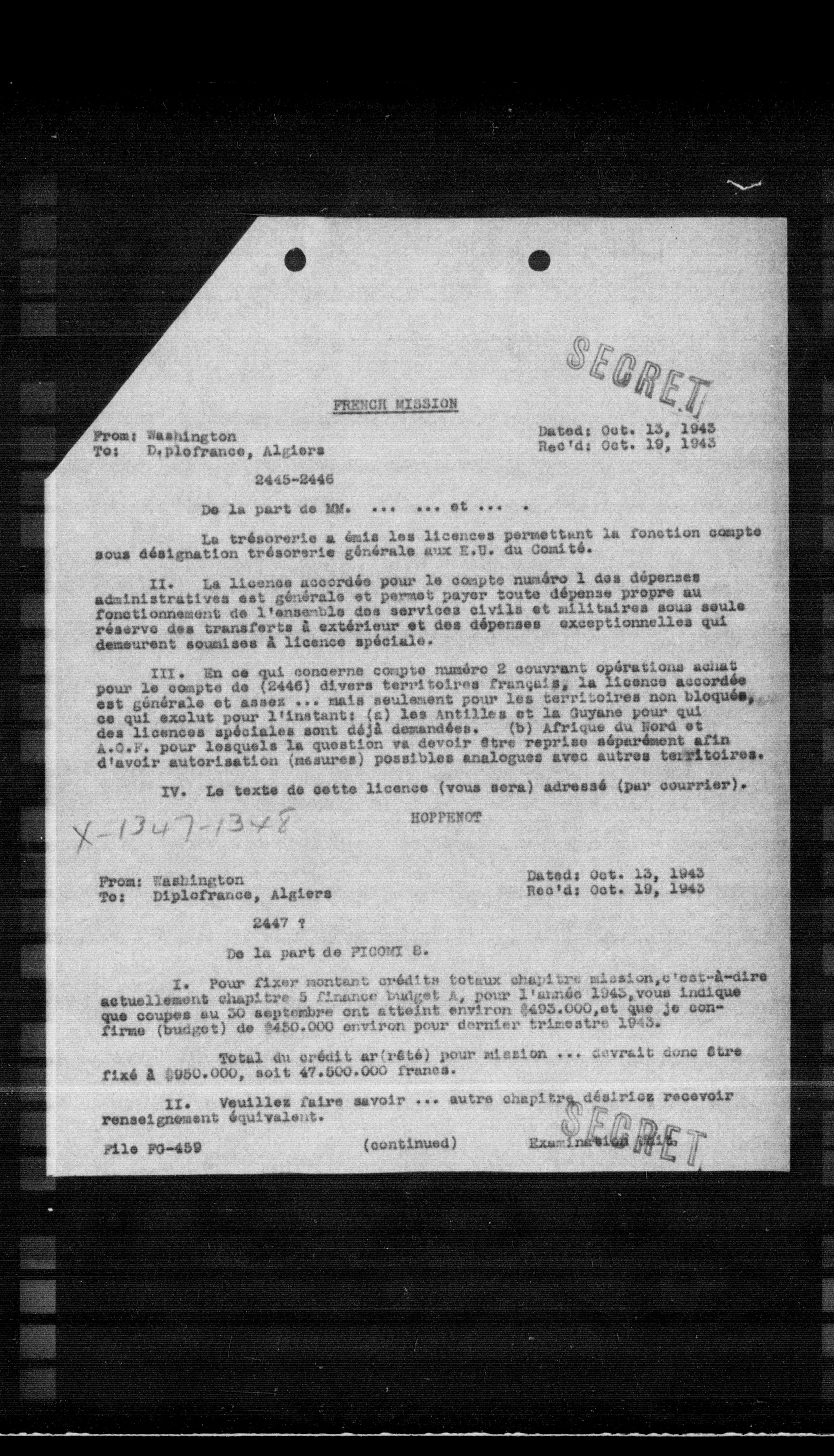 I. Pour fixer montant crédits totaux chapitre mission, c'est-à-dire actuellement chapitre 5 finance budget A, pour l'année 1943, vous indique que coupes au 30 septembre ont atteint environ $493.000, et que je confirme (budget) de $450.000 environ pour dernier trimestre 1943.