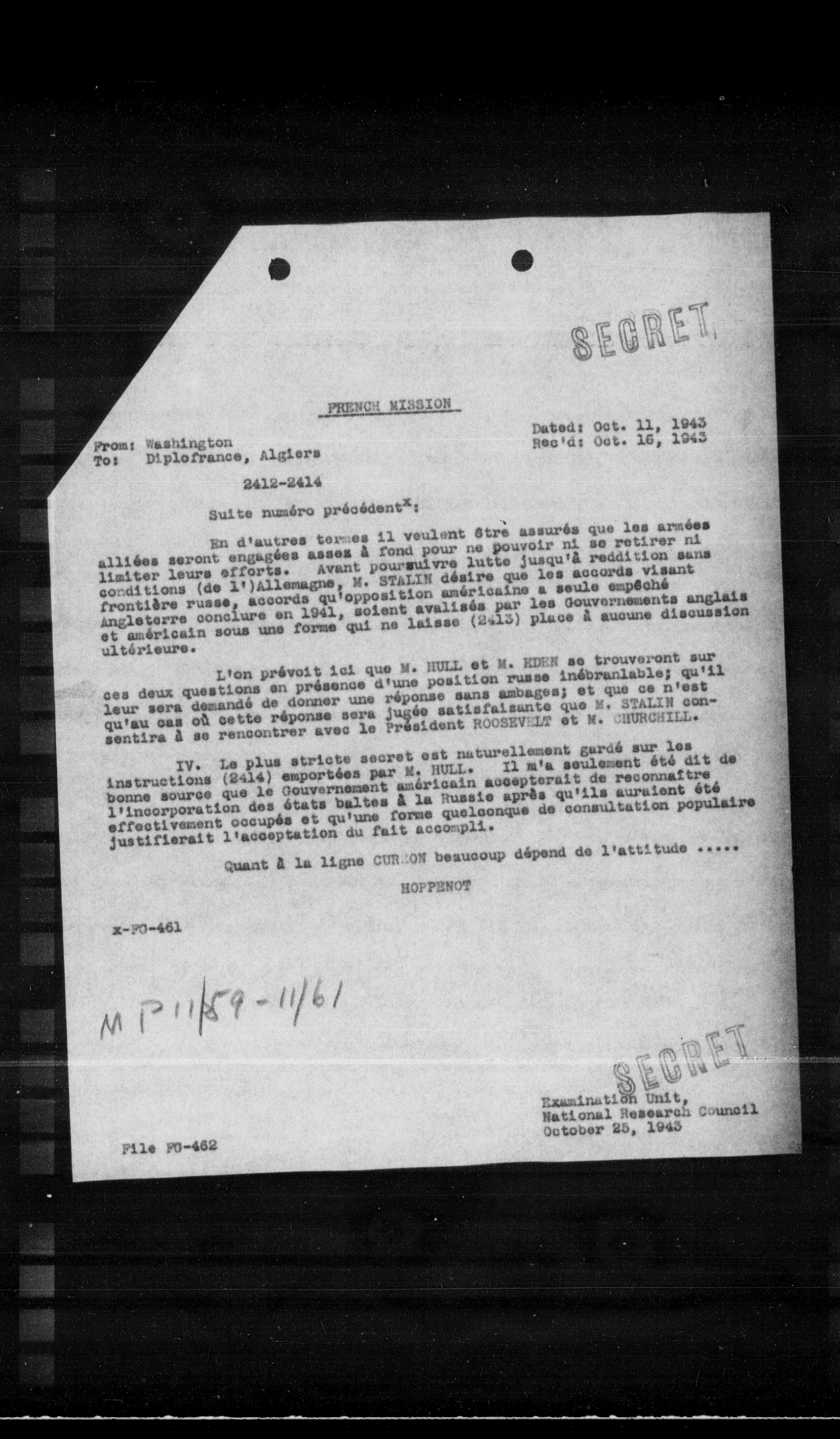 IV. Le plus stricte secret est naturellement gardé sur les instructions (2414) emportées par M. HULL. Il m'a seulement été dit de bonne source que le Gouvernement américain accepterait de reconnaître l'incorporation des états baltes à la Russie après qu'ils auraient été effectivement occupés et qu'une forme quelconque de consultation populaire justifierait l'acceptation du fait accompli.