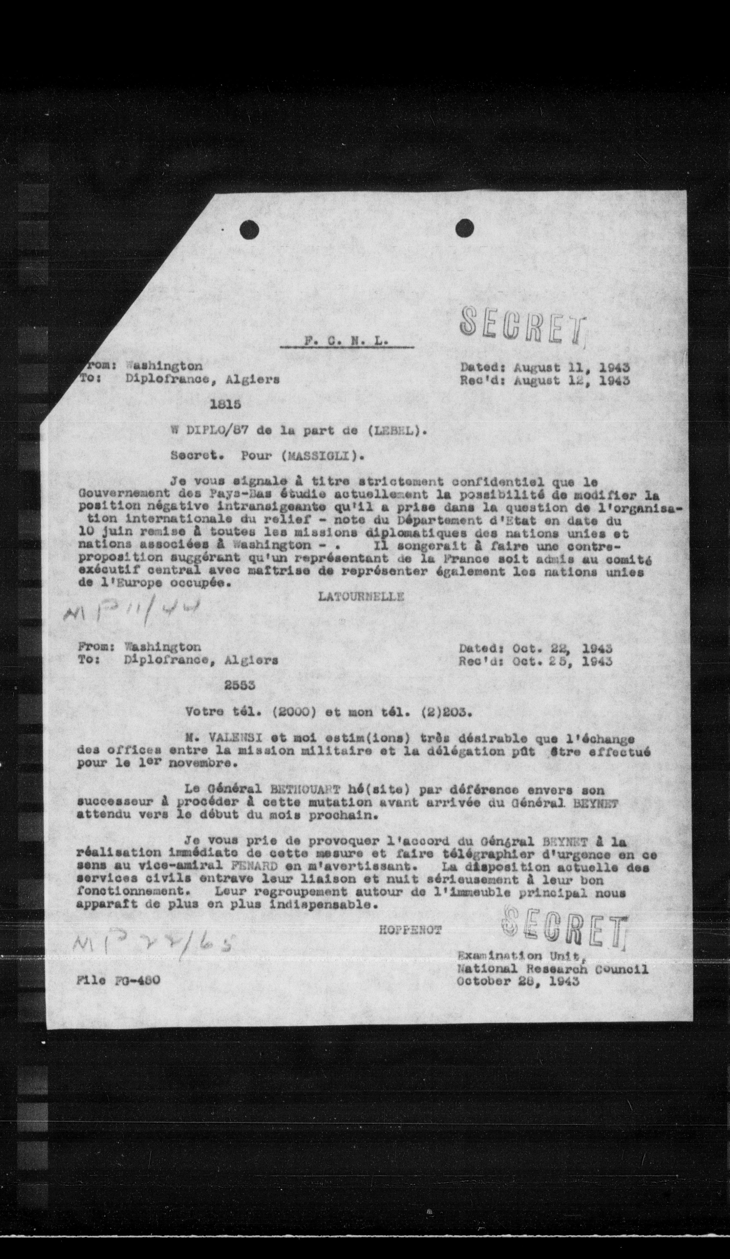 Je vous signale à titre strictement confidentiel que le Gouvernement des Pays-Bas étudie à l'ère du général de l'Etat en date du 10 juin remise à toutes les missions diplomatiques des nations unies et nations associées à Washington - . Il congerait à faire une contre-proposition suggérant qu'un représentant de la France soit admis au comité exécutif central avec maîtrise de représenter également les nations unies de l'Europe occupée.