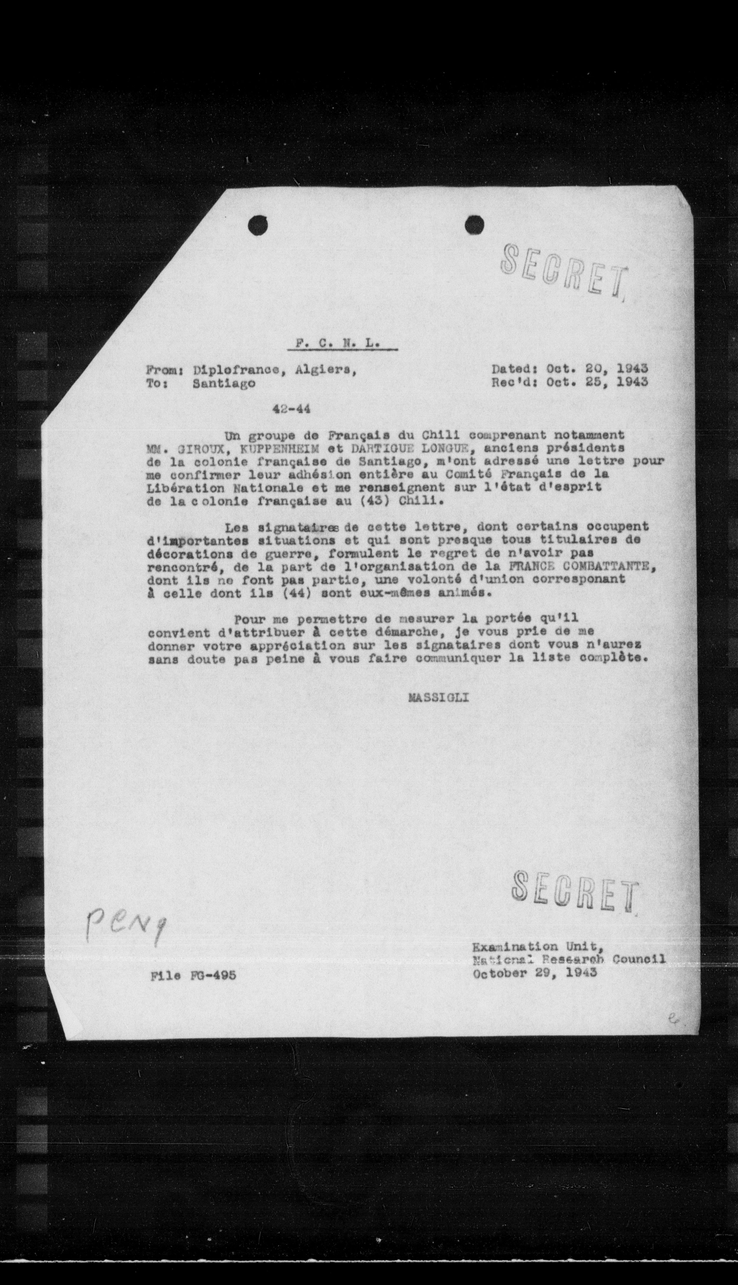 Un groupe de Français du Chili comprenant notamment MM. GIROUX, KUPPENHEIM et DANTIGUE LONGUE, anciens présidents de la colonie française de Santiago, m'ont adressé une lettre pour me confirmer leur adhésion entière au Comité Français de la Libération Nationale et me renseignent sur l'état d'esprit de la colonie française au (43) Chili.