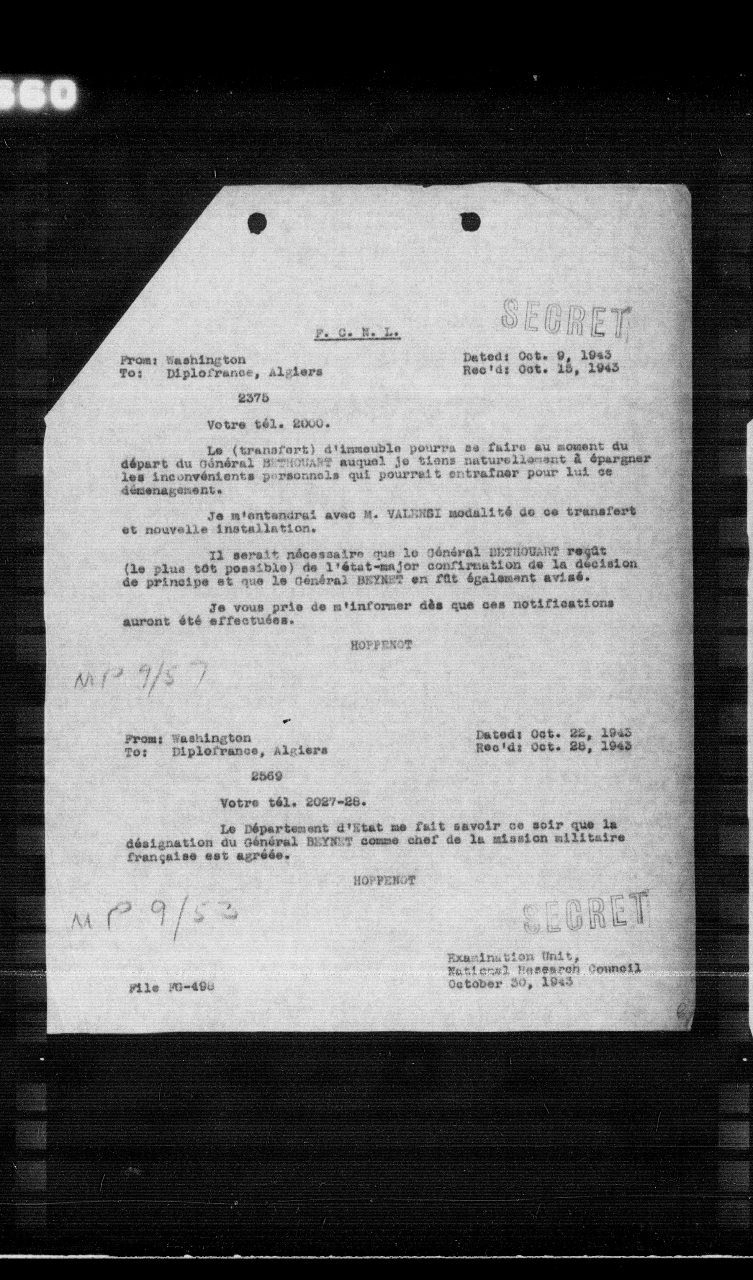 Le Département d'Etat me fait savoir ce soir que la désignation du Général BETHOUART comme chef de la mission militaire française est agréée.