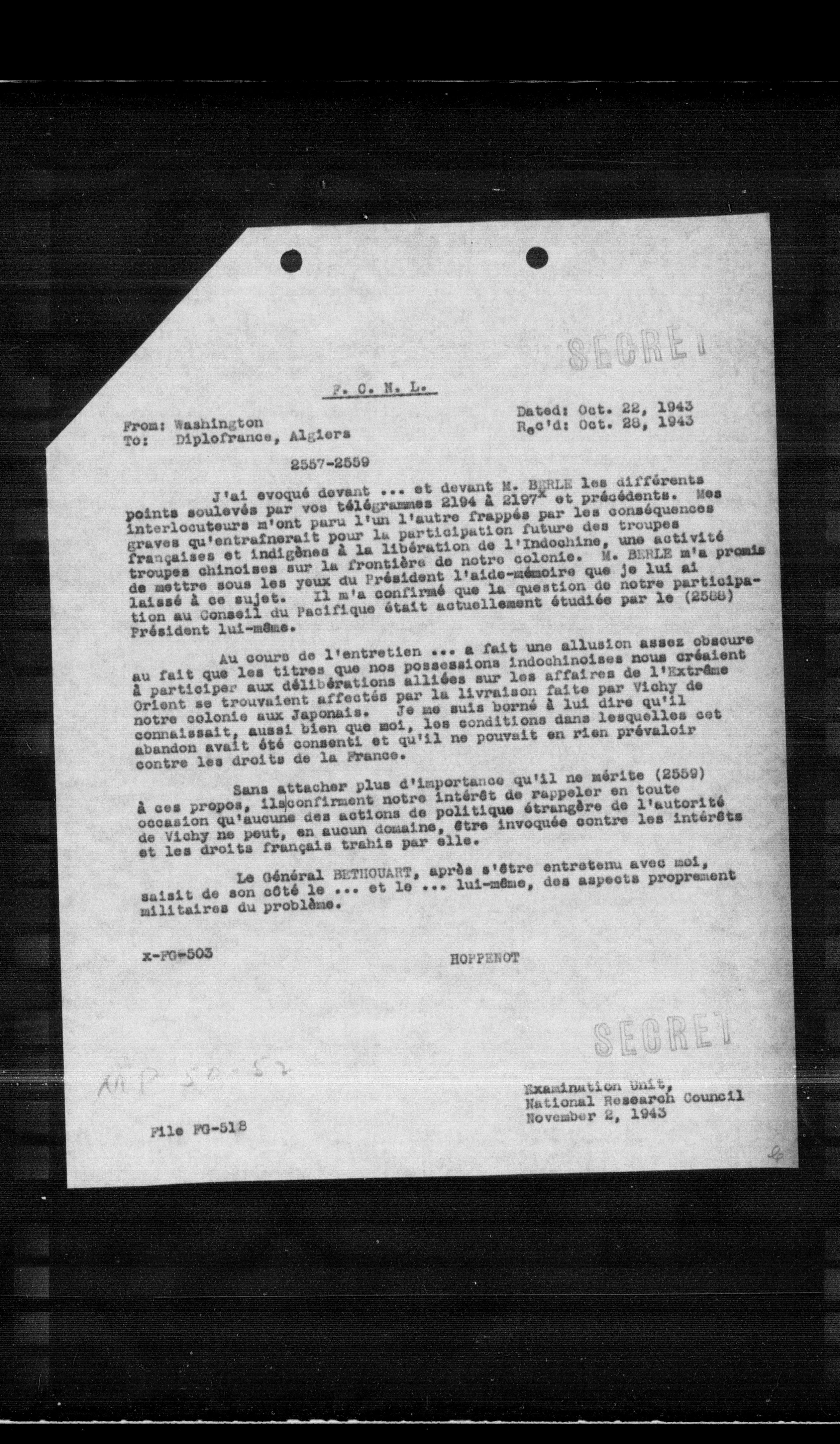 J'ai évoqué devant ... et devant M. BERLE les différents points soulevés par vos télégrammes 2194 à 2197 et précédents. Mes interlocuteurs m'ont paru l'un l'autre frappés par les conséquences graves qu'entraînerait pour la participation future des troupes françaises et indigènes à la libération de l'Indochine, une activité troupes chinoises sur la frontière de notre colonie. M. BERLE m'a promis de mettre sous les yeux du Président l'aide-mémoire que je lui ai laissé à ce sujet. Il m'a confirmé que la question de notre participation au Conseil du Pacifique était actuellement étudiée par le (2559) Président lui-même.