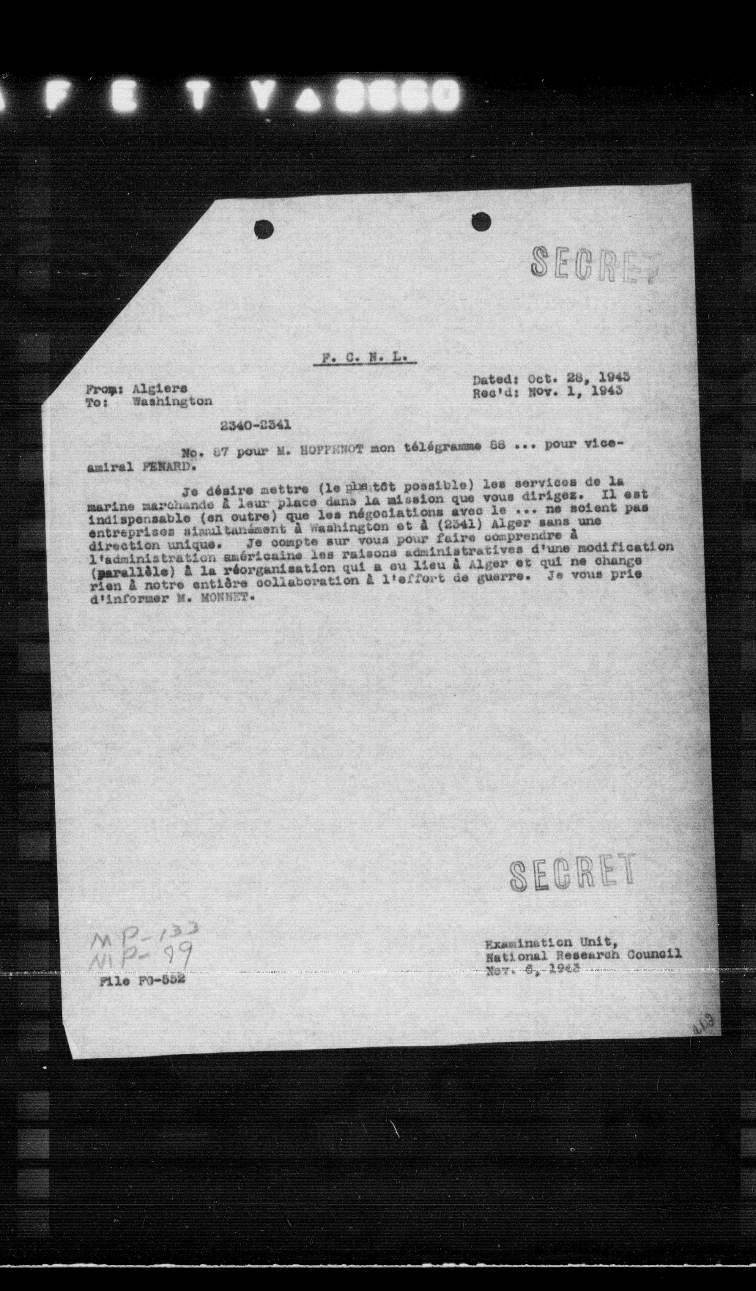 Je désire mettre (le pointot possible) les services de la marine marchande a leur place dans la mission que vous dirigez. Il est indispensable (en outre) que les négociations avec le ... ne soient pas entrepries simultanément a Washington et a (2341) Alger sans une direction unique. Je compte sur vous pour faire comprendre a l'administration axéricaine les raisons administratives d'une modification (parallele) a la réorganisation qui a eu lieu a Alger et qui ne change rien a notre entière collaboration a l'effort de guerre. Je vous prie d'informer M. MONNET.