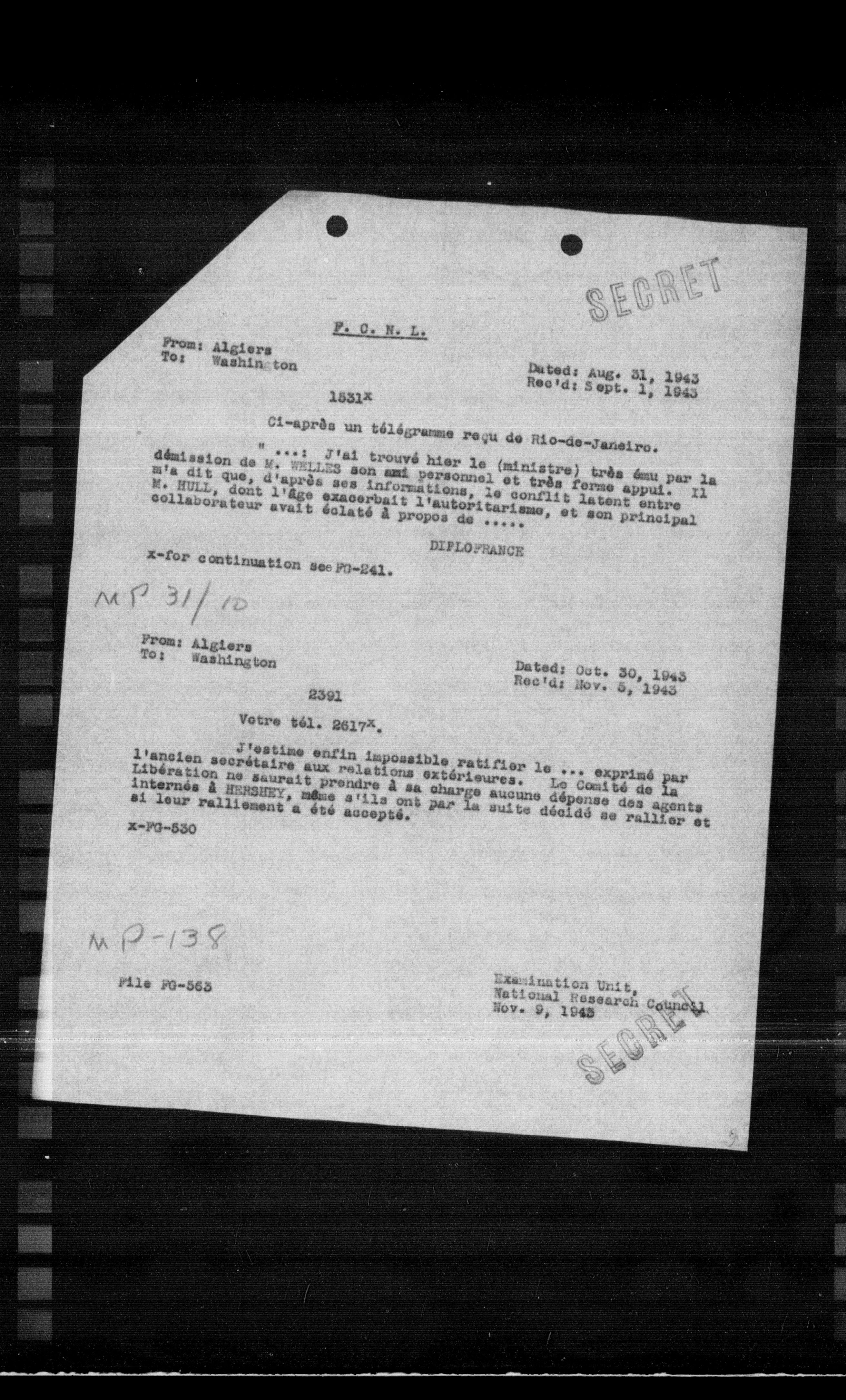 démission de M. WELLES son ami personnel et très forme appui. Il m'a dit que, d'après ses informations, le conflit latent entre M. HULL, dont l'áge exacerbait l'autoritarisme, et son principal collaborateur avait éclaté à propos de .....