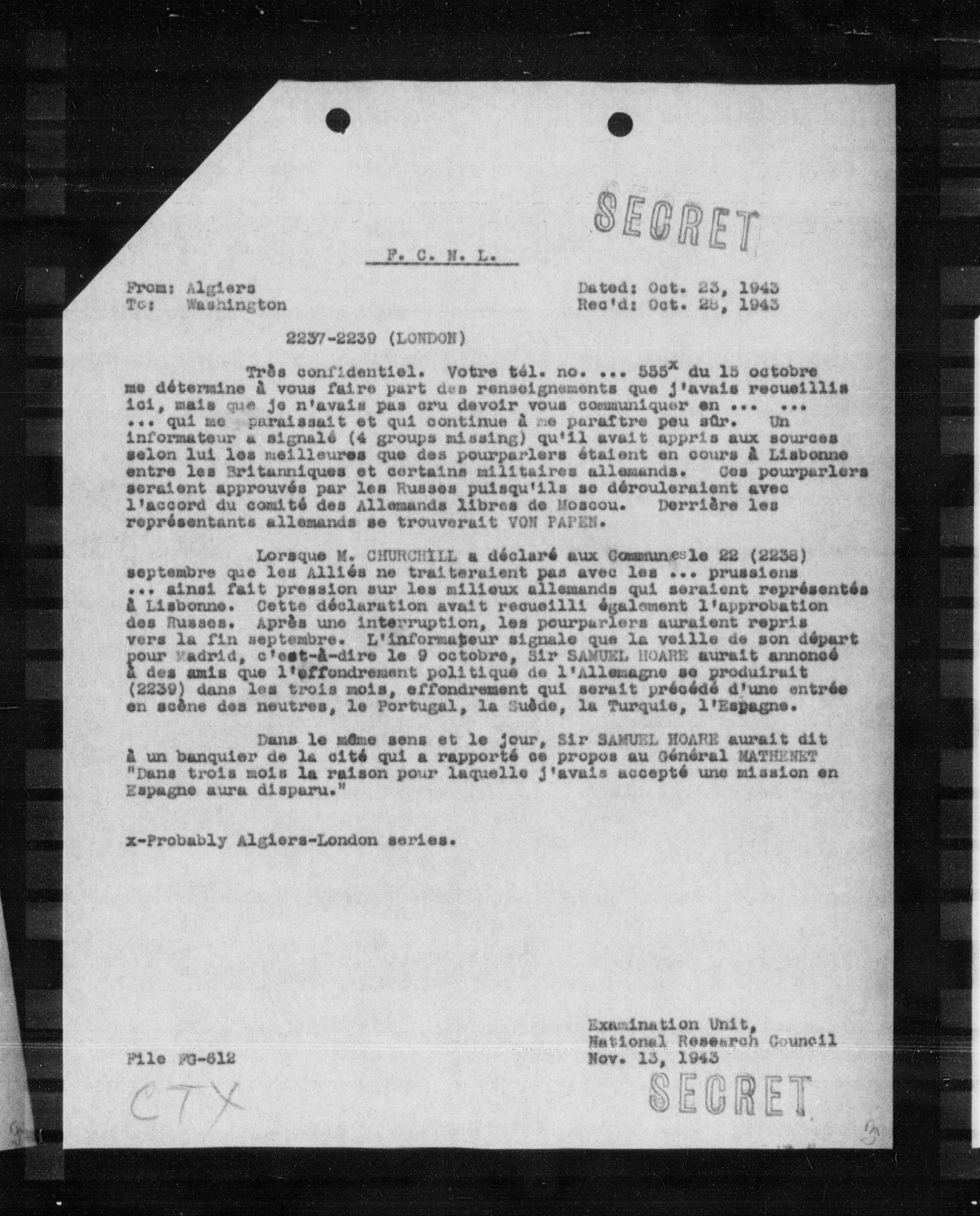 Lorsque M. CHURCHILL a déclaré aux Communes le 22 (2238) septembre que les Alliés ne traiteraient pas avec les ... prussiens ... ainsi fait pression sur les milieux allemands qui seraient représentés à Lisbonne. Cette déclaration avait recueilli également l'approbation des Russes. Après une interruption, les pourparlers auraient repris vers la fin septembre. L'informateur signale que la veille de son départ pour Madrid, c'est-à-dire le 9 octobre, Sir SAMUEL HOARE aurait annoncé à des amis que l'effondrement politique de l'Allemagne se produirait (2239) dans les trois mois, effondrement qui serait précédé d'une entrée en scène des neutres, le Portugal, la Suède, la Turquie, l'Espagne.