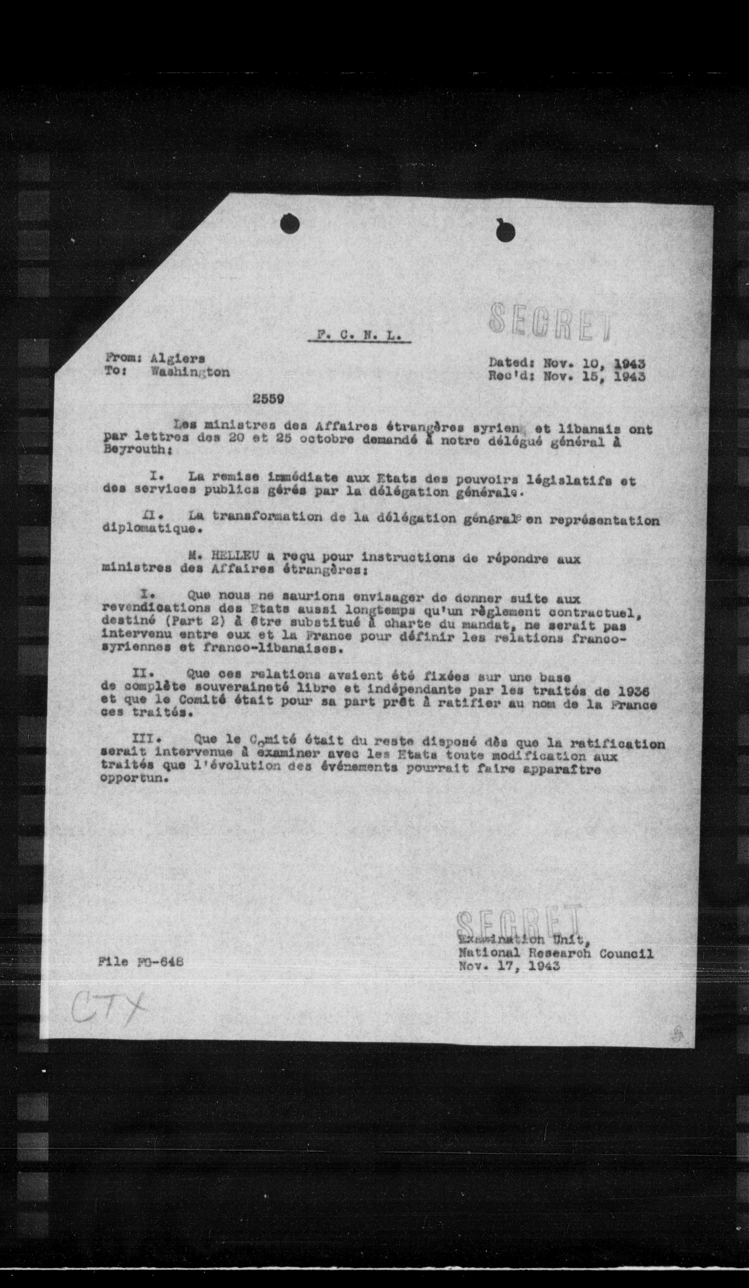 II. Que ces relations avaient été fixées sur une base de complete souveraineté libre et indépendante par les traités de 1936 et que le Comité était pour sa part prêt a ratifier au nom de la France ces traités.
