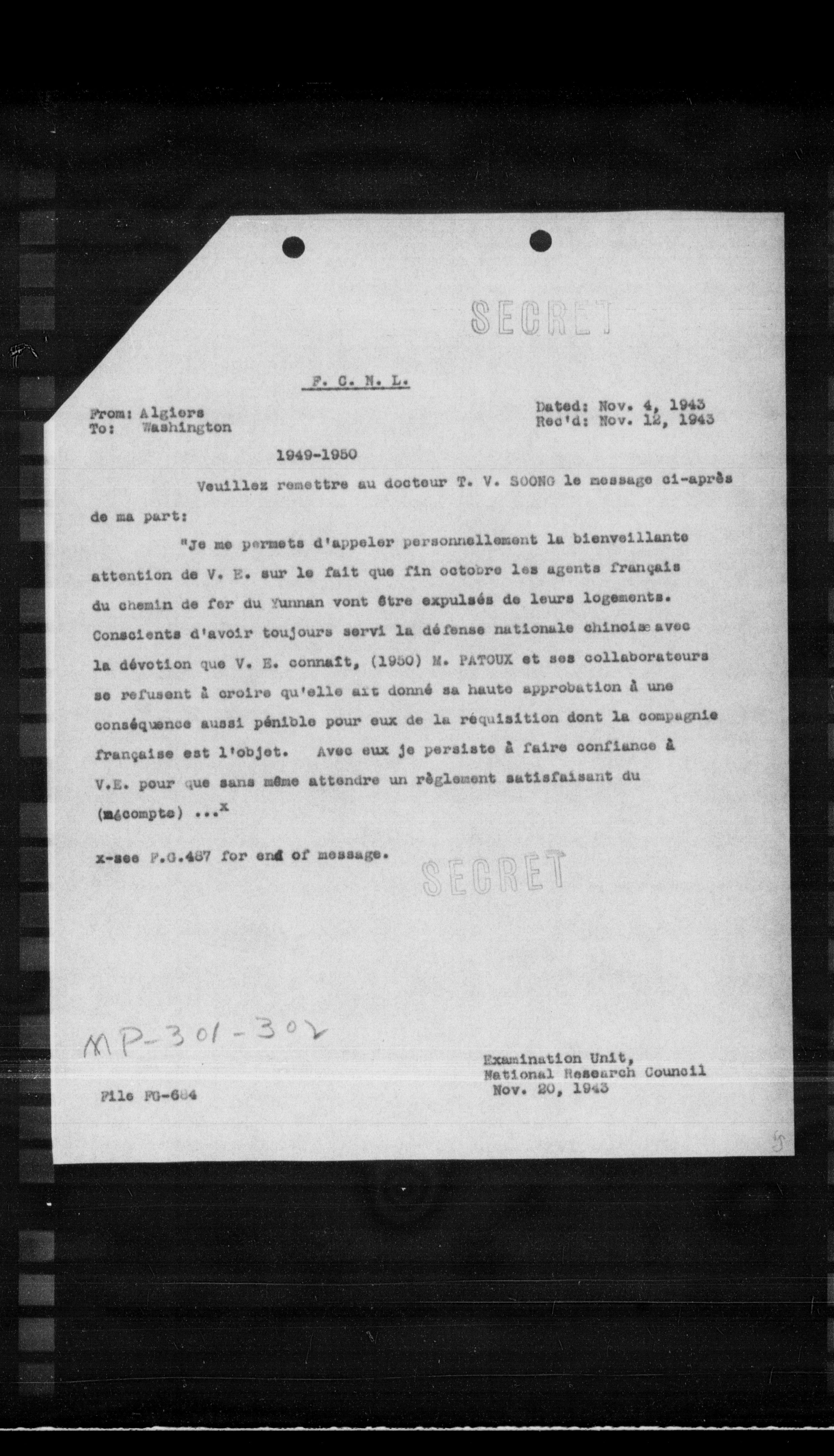 "Je me permets d'appeler personnellement la bienveillante attention de V. E. sur le fait que fin octobre les agents français du chemin de fer du Tuman vont etre expulsés de leurs logements. Consclents d'avolr toujours servi la défense nationale chinola avec la dévotion que V. E. connait, (1950) M. PATOUX et ses collaborateurs se refusent a croire qu'elle ait donné sa haute approbation a une conséquence aussi penible pour eux de la requlzition dont la compagnie française est l'objet. Avec eux je persiste a faire confiance a V.E. pour que sans meme attendre un régloment satisfaisant du (mácompte) ...x
