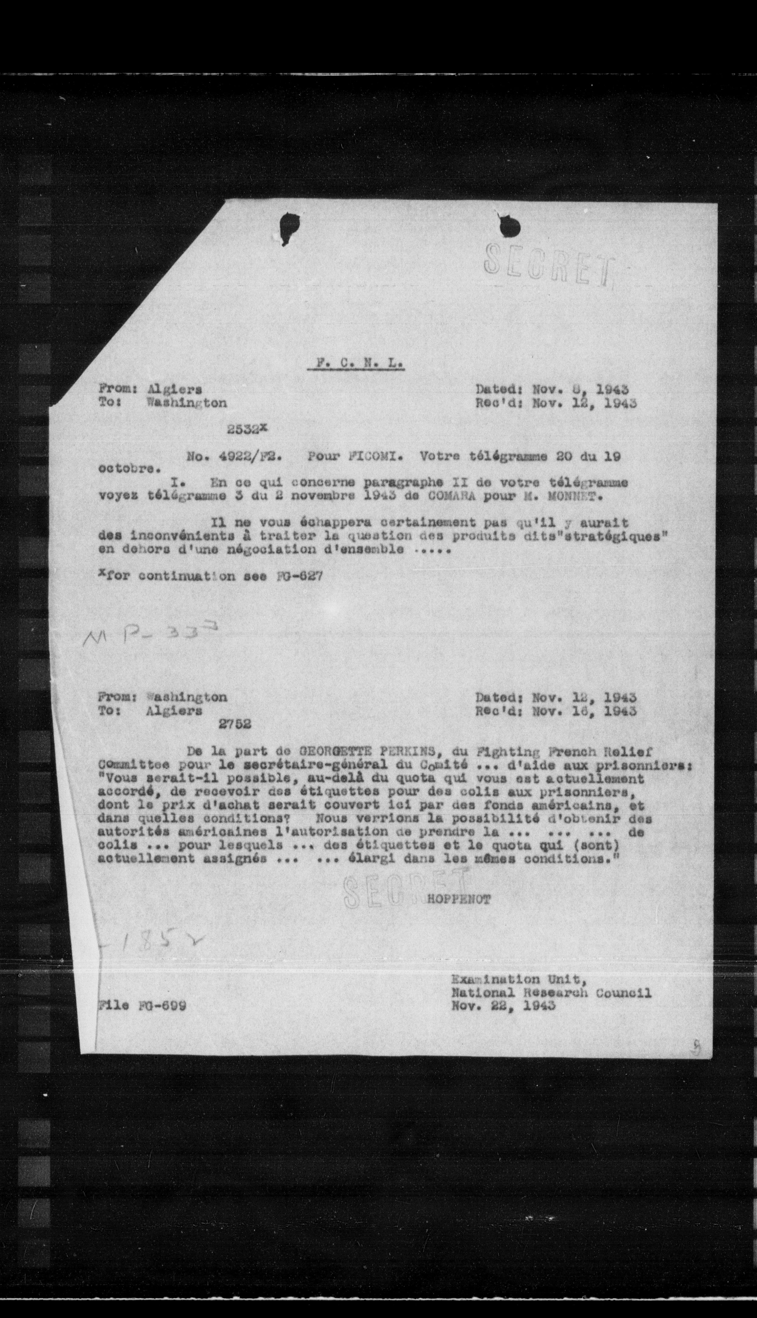 **De la part de GEORGETTE PEREIRE, du Fighting French Relief Committee pour le secrétaire-général du Comité, d'aide aux prisonniers: "Vous serait-il possible, au-delà du quota qui vous est actuellement accordé, de recevoir des étiquettes pour des colis aux prisonniers, dont le prix d'achat serait couvert ici par des fonds américains, et dans quelles conditions" Nous verrons la possibilité d'obtenir des autorités américaines l'autorisation de prendre la ... de colis, pour lesquels des étiquettes et le quota qui (sont) actuellement assignés ... élargi dans les mêmes conditions."**