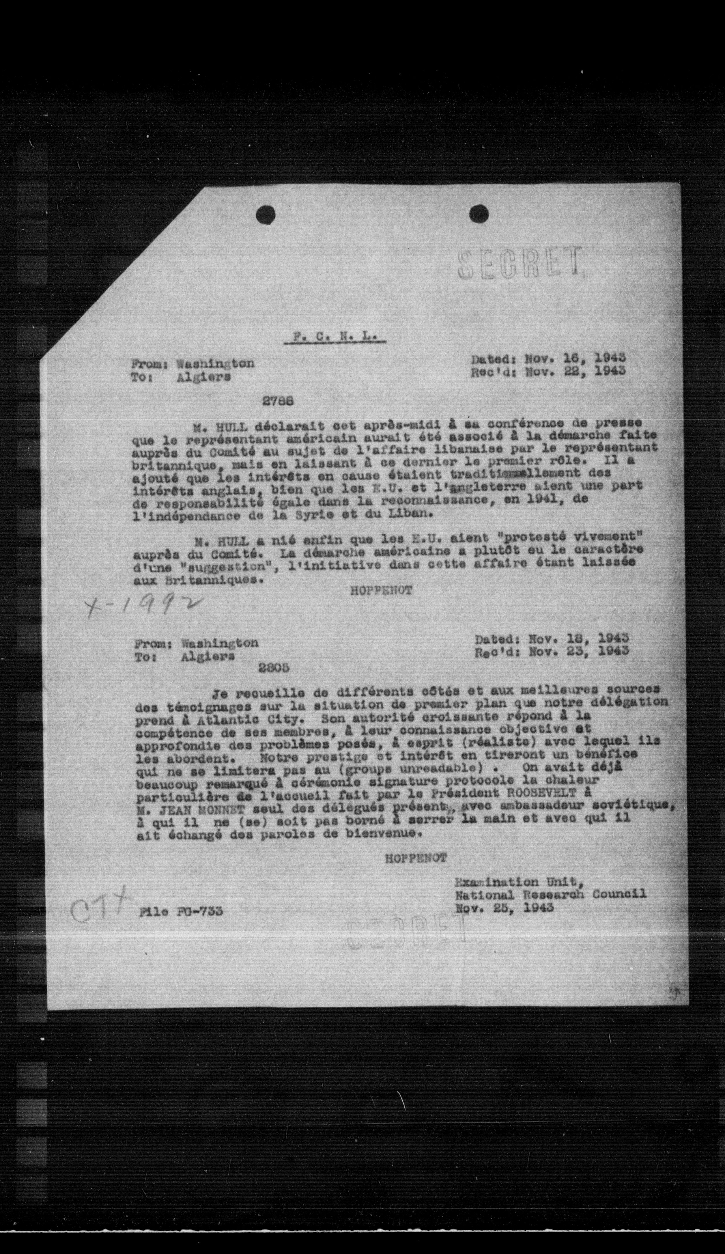 H. HULL déclarait cet après-midi a sa conférence de presse que le représentant américain aurait été associé a la démarche faite auprès du Comite au sujet de l'affaire libanaiso par le représentant britannique, mais en laissant a ce dernier le premier role. Il a ajouté que les intérêts en cause étaient traditioxaillement des intérêts anglais, bien que les E.U. et l'Angleterre aient une part de responsabilité égale dans la reconnaissance, en 1941, de l'indépendance de la Syrie et du Liban.