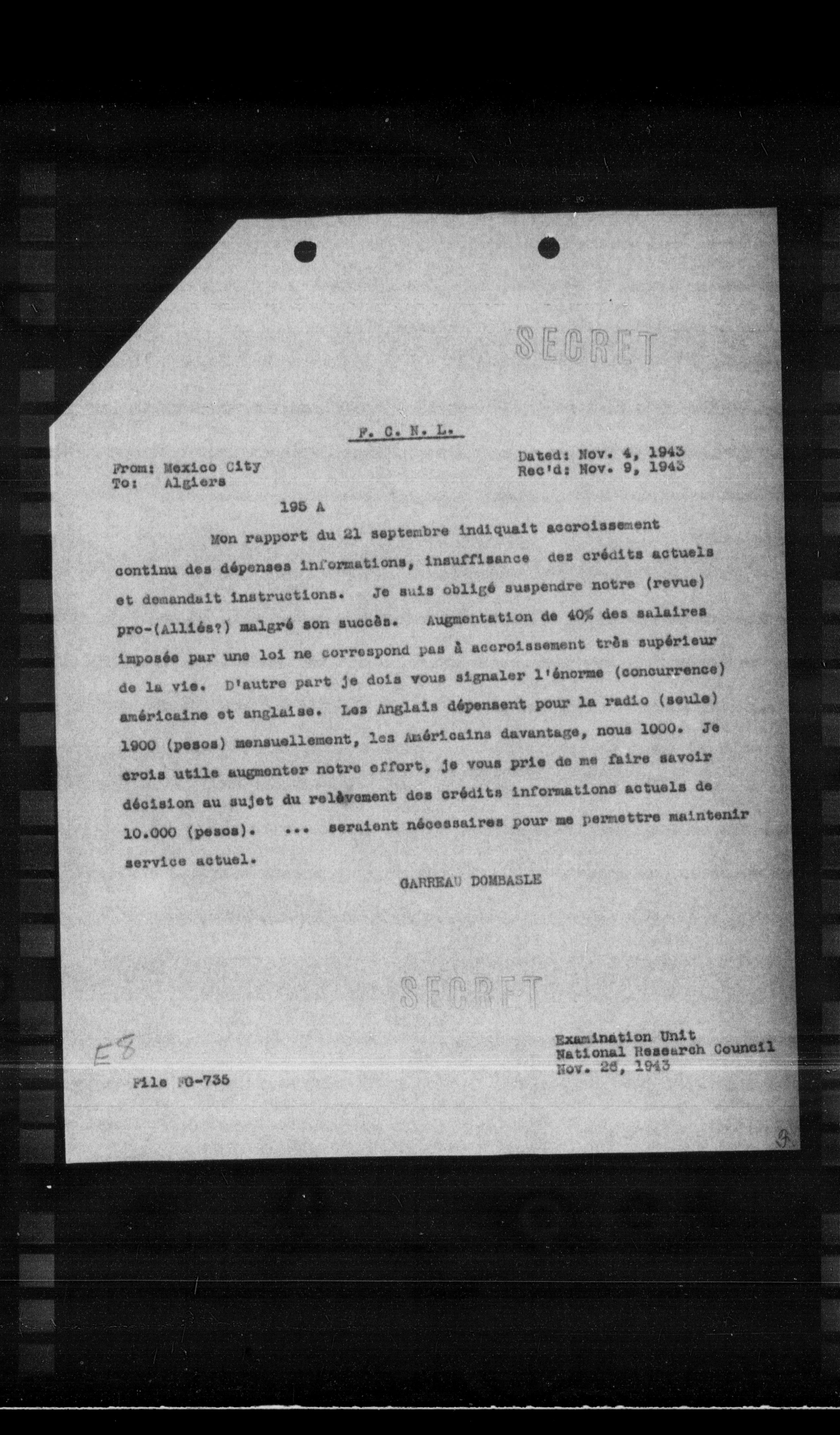 continu des dépenses informations, insuffisance des crédits actuels et demandait instructions. Je suis obligé suspendre notre (revue) pro-(Alliés?) malgré son succès. Augmentation de $40 \%$ des salaires imposée par une loi ne correspond pas à accroissement très supérieur de la vie. D'autre part je dois vous signaler l'énorme (concurrence) américaine et anglaise. Les Anglais dépensent pour la radio (seule) 1900 (pesos) mensuellement, les Américains davantage, nous 1000. Je crois utile augmenter notre effort, je vous prie de me faire savoir décision au sujet du relèvement des crédits informations actuels de 10.000 (pesos). ... seraient nécessaires pour me permettre maintenir service actuel.