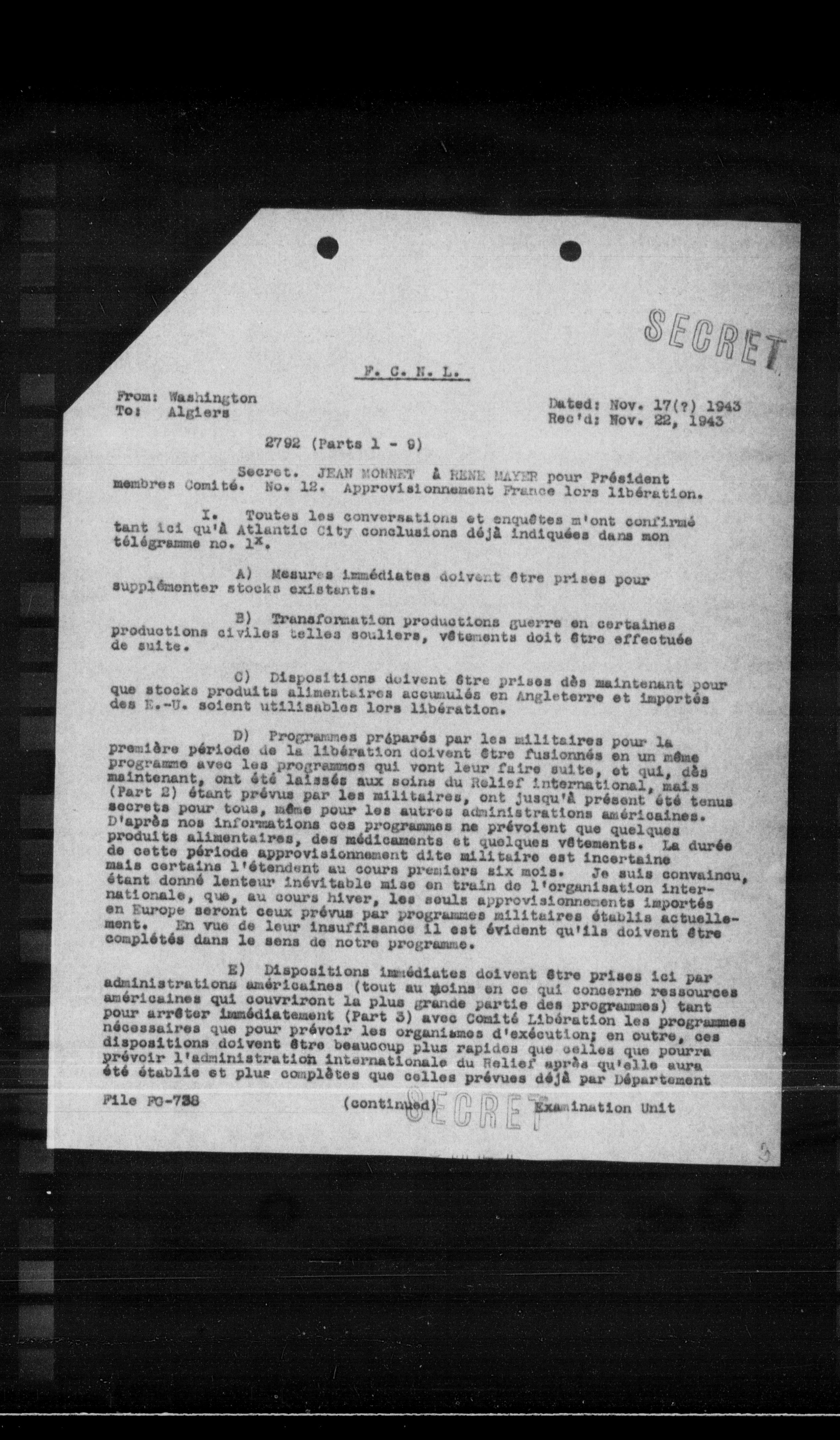 D) Programmes préparés par les militaires pour la première période de la libération doivent être fusionnés en un même programme avec les programmes qui vont leur faire suite, et qui, dès maintenant, ont été laissés aux soins du Relief International, mais (Part 2) étant prévus par les militaires, ont jusqu'à présent été tenus secrets pour tous, même pour les autres administrations américaines. D'après nos informations ces programmes ne prévoient que quelques produits alimentaires, des médicaments et quelques vêtements. La durée de cette période approvisionnement dite militaire est incertaine mais certains l'étendent au cours premiers six mois. Je suis convaincu, étant donné lenteur inévitable mise en train de l'organisation internationale, que, au cours hiver, les seuls approvisionnements importés en Europe seront ceux prévus par programmes militaires établis actuellement. En vue de leur insuffisance il est évident qu'ils doivent être complétés dans le sens de notre programme.