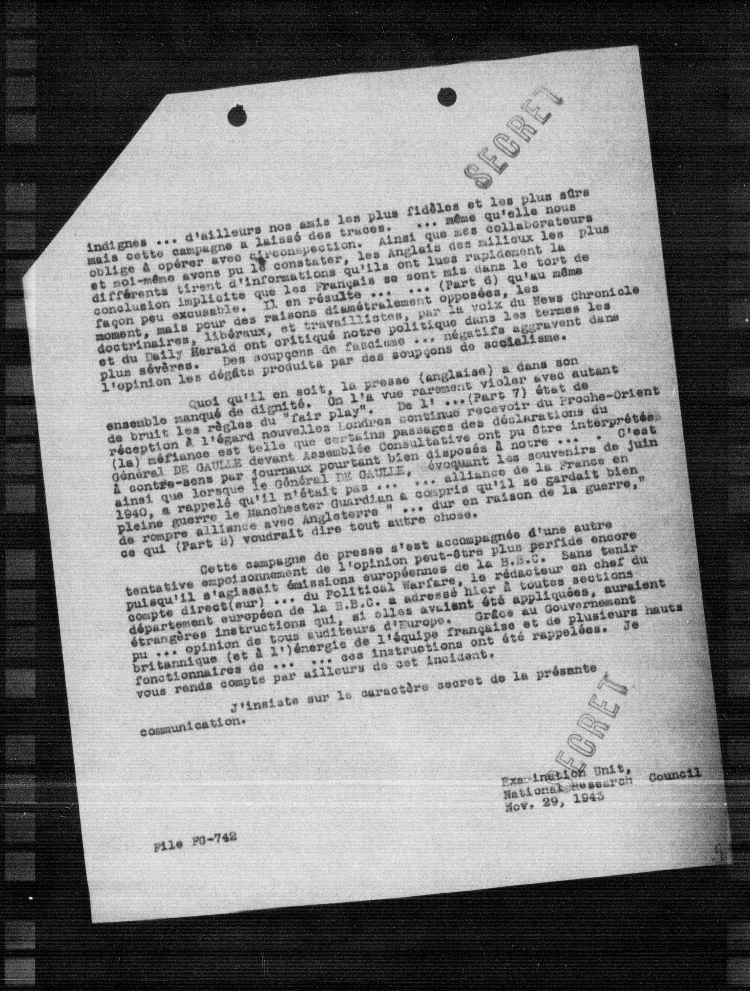 Cette campagne de presse s'est accompagnée d'une autre tentative empoisonnement de l'opinion peut-être plus perfide encore puisqu'il s'agissait émissions européennes de la B.B.C. Sans tenir compte direct (eur) ... du Political Warfare, le rédacteur en chef du département européen de la B.B.C. a adressé hier à toutes sections étrangères instructions qui, si elles avaient été appliquées, auraient pu ... opinion de tous auditeurs d'Europe. Grâce au Gouvernement britannique (et à l'énergie de l'équipe française et de plusieurs hauts fonctionnaires de ... ... ces instructions ont été rappelées. Je vous rends compte par ailleurs de cet incident.