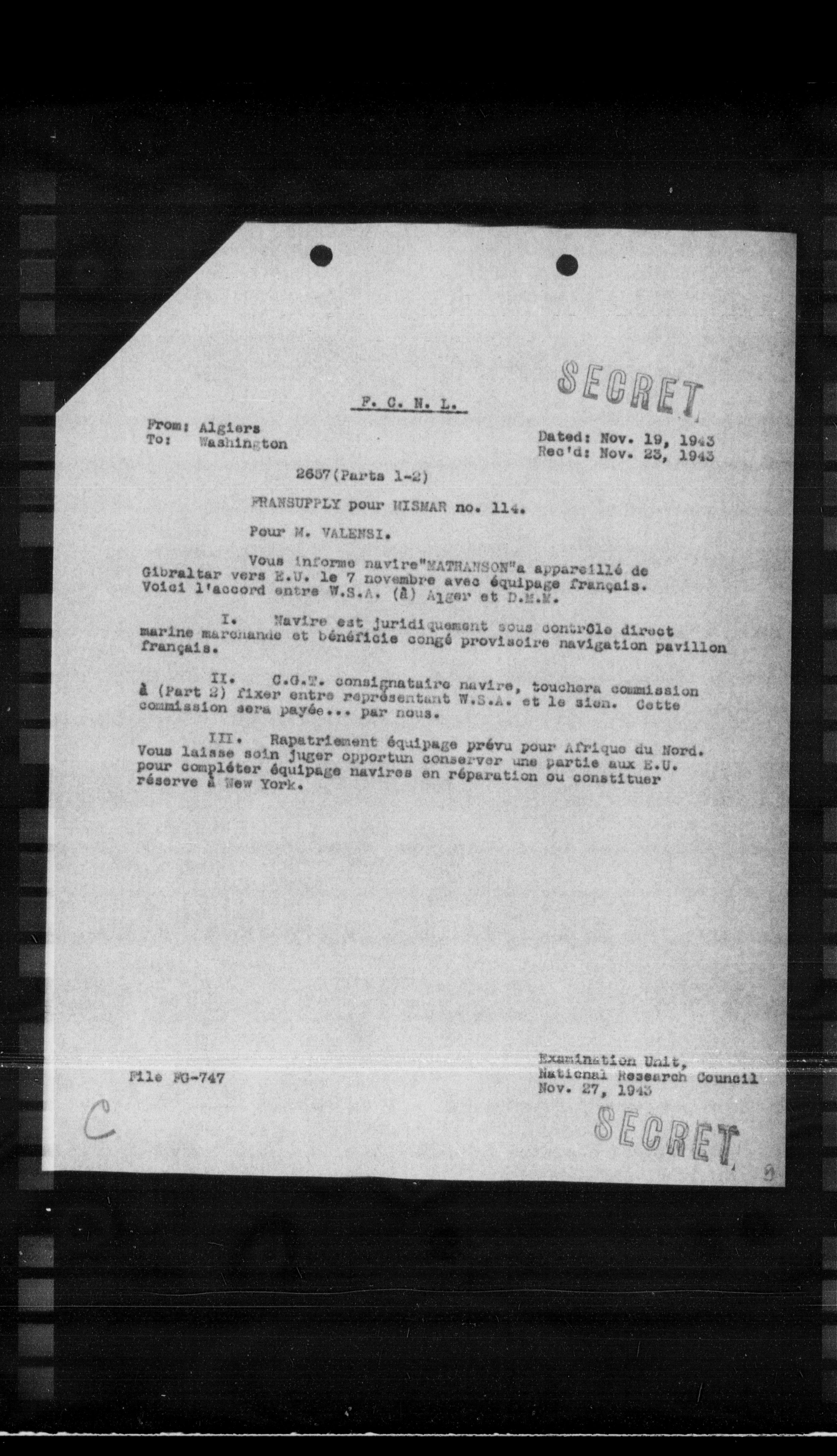 Vous informe navire "MATHANSON" a appartillé de Gibraltar vers E.U. le 7 novembre avec équipage français. Voici l'accord entre W.N.A. (A) Alger et D.M.W.