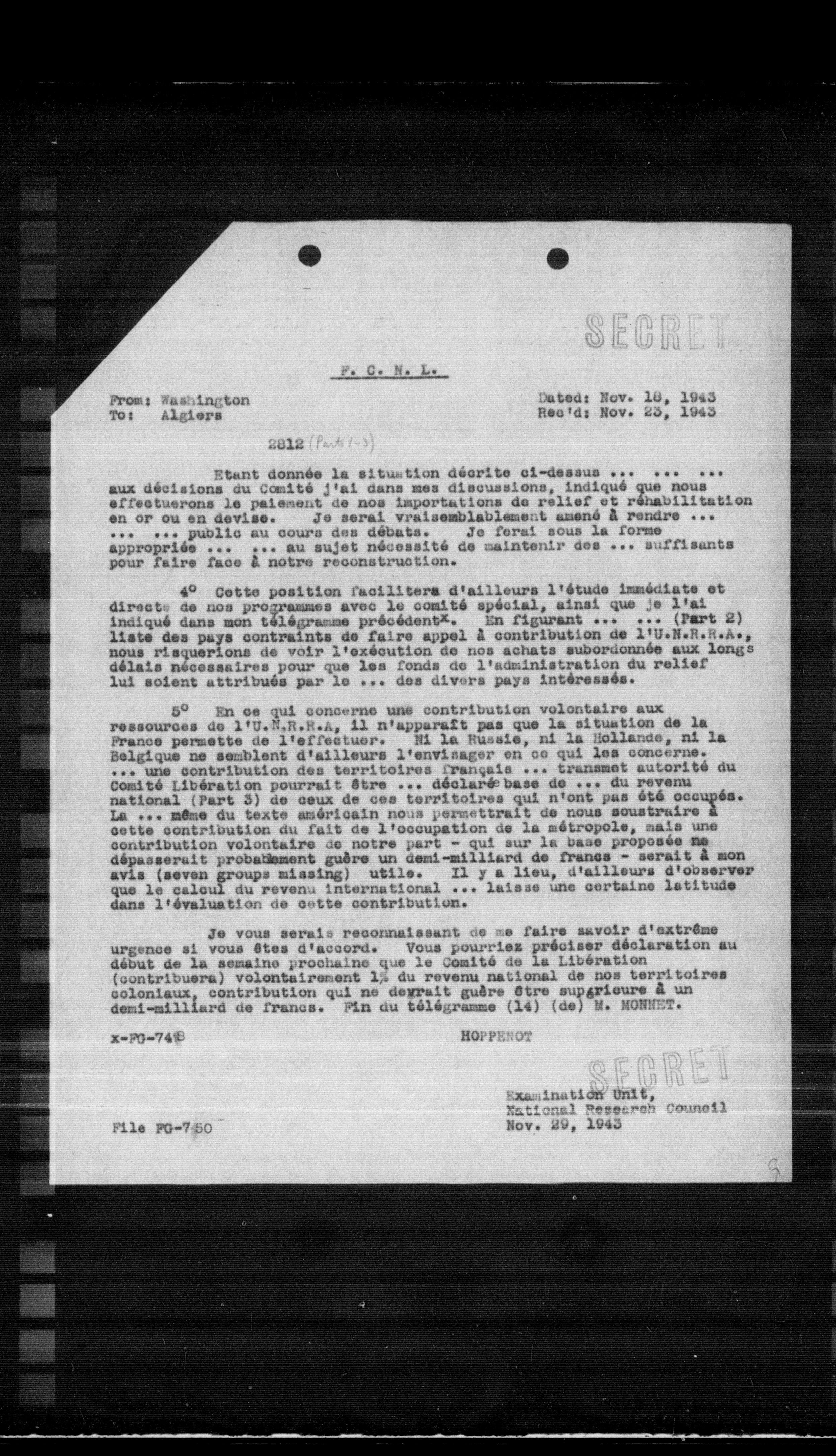 Je vous serais reconnaissant de me faire savoir d'extrême urgence si vous êtes d'accord. Vous pourriez préciser déclaration au début de la semaine prochaine que le Comité de la libération (contribuera) volontairement 15 du revenu national de nos territoires coloniaux, contribution qui ne devrait guère être supérieure à un demi-millilard de francs. Fin du télégramme (14) (de) M. NONNET.
