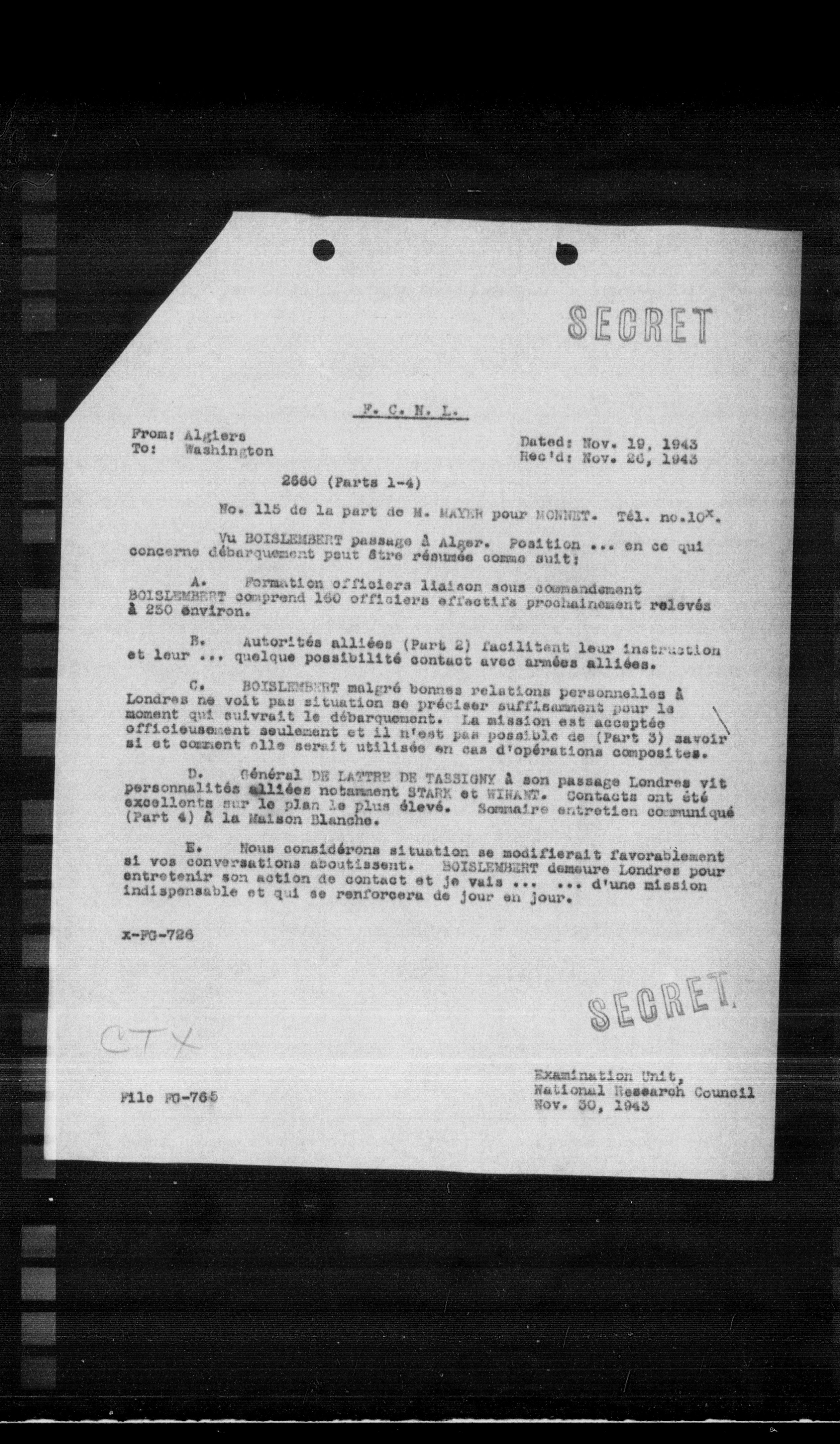 C. BOISLEMSENT malgré bonnes relations personnelles à Londres ne voit pas situation se préciser suffisamment pour le moment qui suivrait le débarquement. La mission est acceptée officieusement seulement et il n'est pas possible de (Part 3) savoir si et comment elle serait utilisée en cas d'opérations composites.
