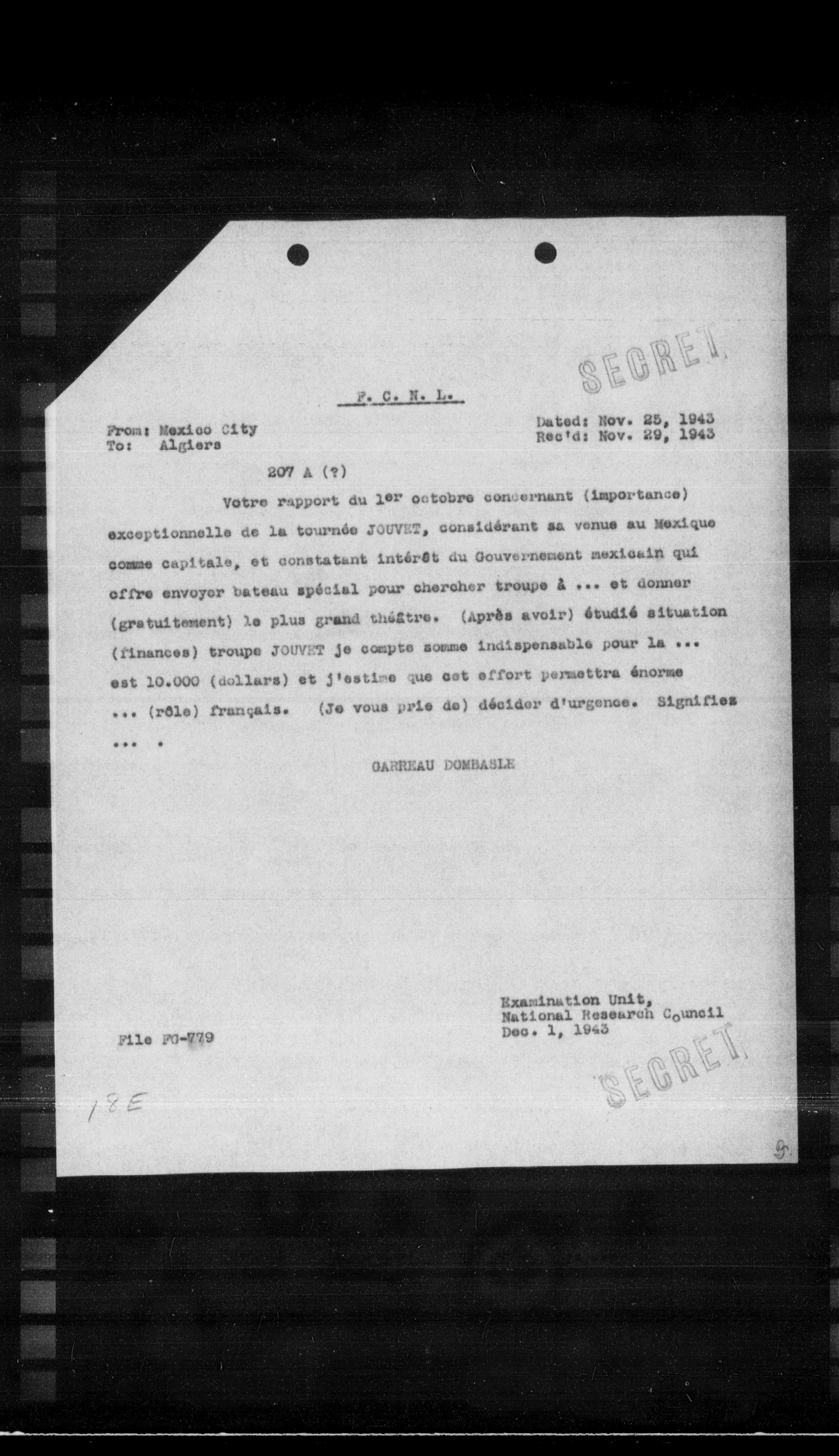 Votre rapport du ler octobre concernant (importance) exceptionnelle de la tournée JOUVET, considérant sa venue au Mexique comme capitale, et constatant intérêt du Gouvernement mexicain qui offre envoyer bateau spécial pour chercher troupe 4 ... et donner (gratuitement) le plus grand thá̂tre. (Après avoir) étudié situation (finances) troupe JOUVET je compte somme indispensable pour la ... est 10.000 (dollars) et j'estine que cet effort permettra énorme ... (roie) français. (Je vous prie de) décider d'urgence. Signifiez