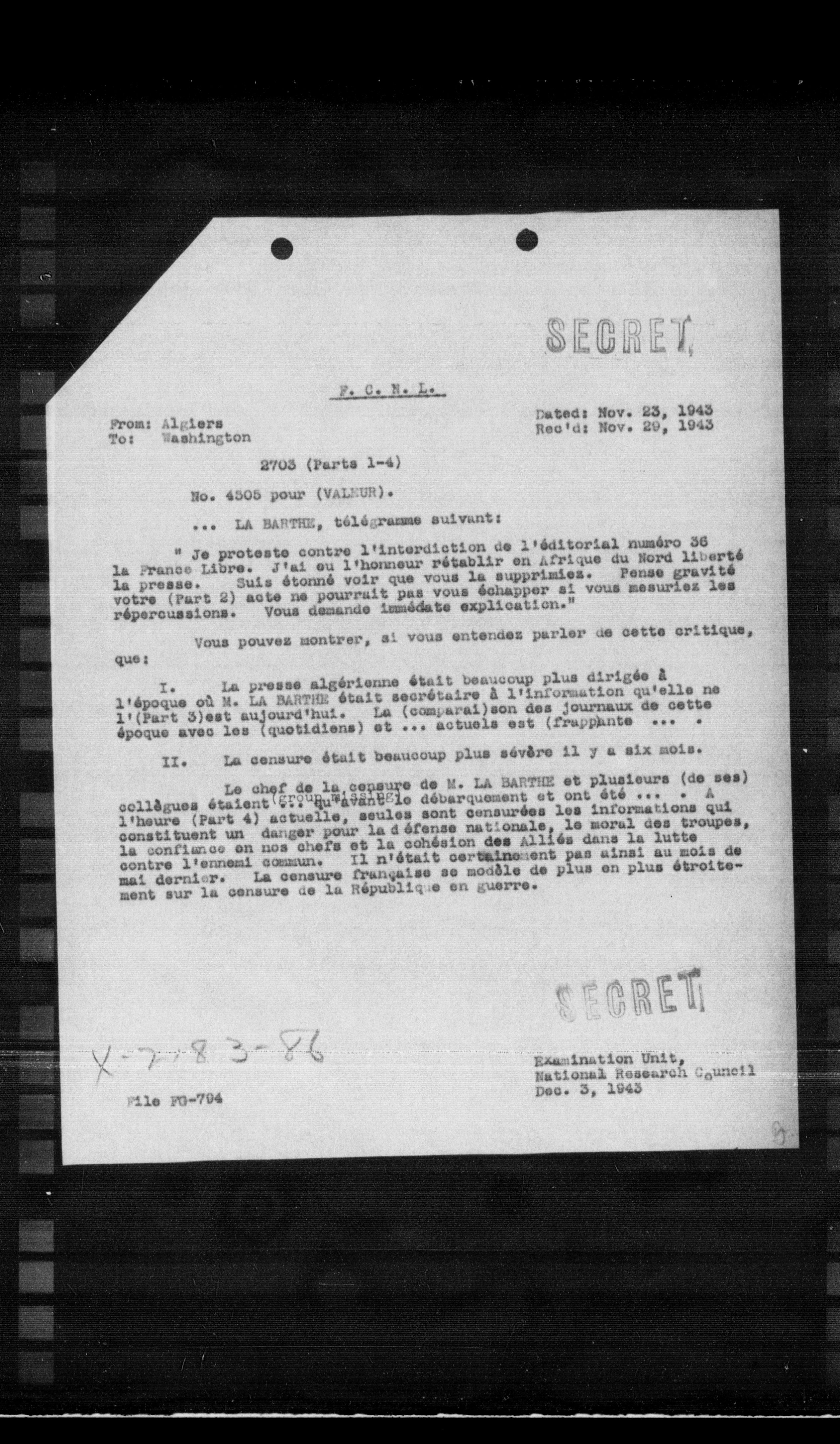 "Je proteste contre l'interdiction de l'éditorial numéro 36 la France Libre. J'ai eu l'honneur rétablir en Afrique du Nord liberté la presse. Puis étonné voir que vous la supprimiez. Pense gravité votre (Part 2) acte ne pourrait pas vous échapper si vous mesuriez les répercussions. Vous demande immédiate explication."