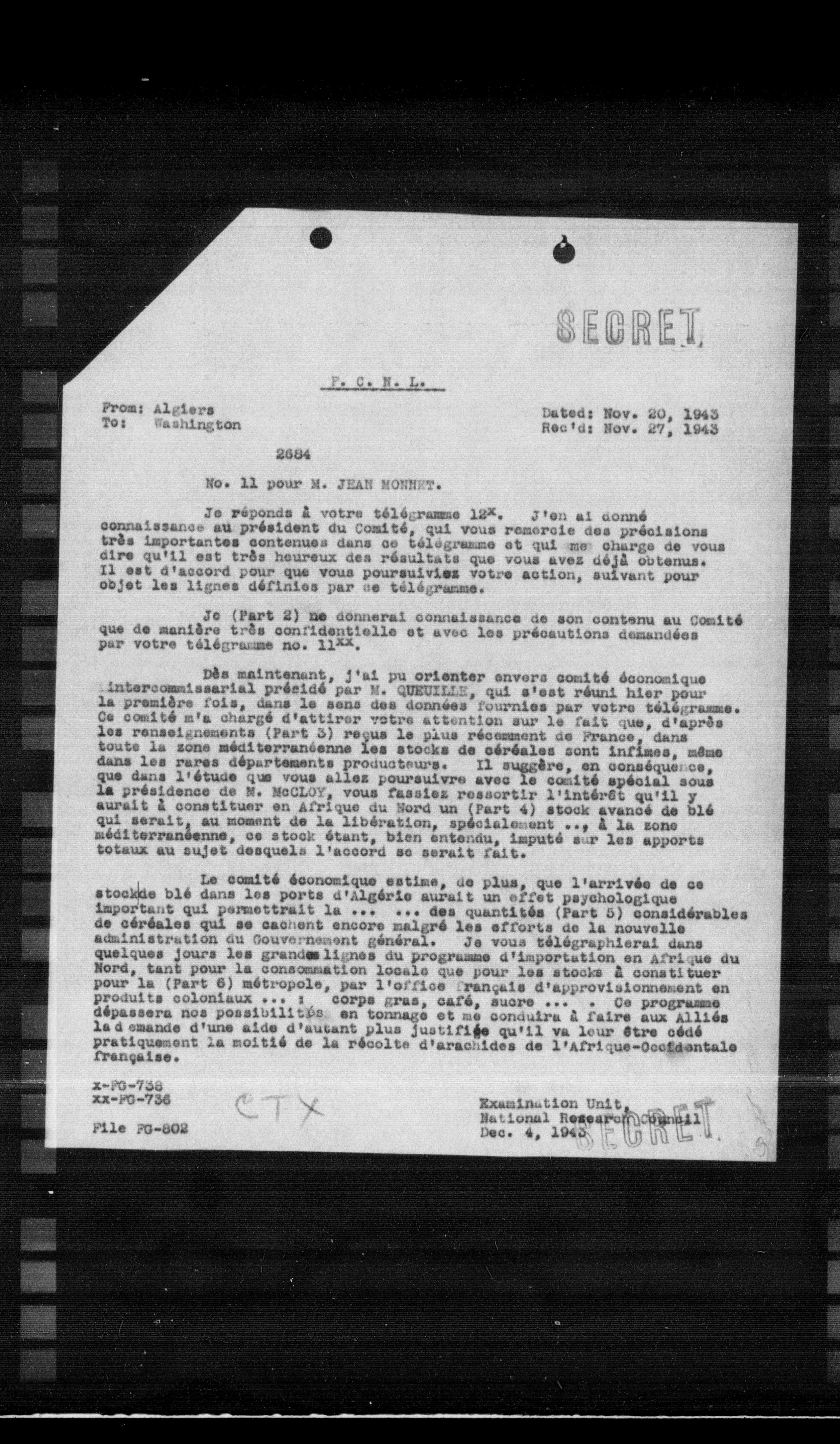 Dès maintenant, j'ai pu orienter envers la société économique intercommunale précisée par M. QUEUILLE, qui s'est réuni hier pour la première fois, dans le sens des données fournies par votre télégramme. Ce comité m'a chargé d'attirer votre attention sur le fait que, d'après les renseignements (Part 3) reçus, le plus récemment de France, dans toute la zone méditerranéenne les stocks de céréales sont infimes, même dans les rares départements producteurs. Il suggère, en conséquence, que dans l'étude que vous allez poursuivre avec le comité spécial sous la présidence de M. NICOLOT, vous fassiez ressortir l'intérêt qu'il y aurait à constituer en Afrique du Nord un (Part 4) stock avancé de blé qui serait, au moment de la libération, spécialement à la zone méditerranéenne, ce stock étant, bien entendu, imputé sur les apports totaux au sujet desquels l'accord se serait fait.