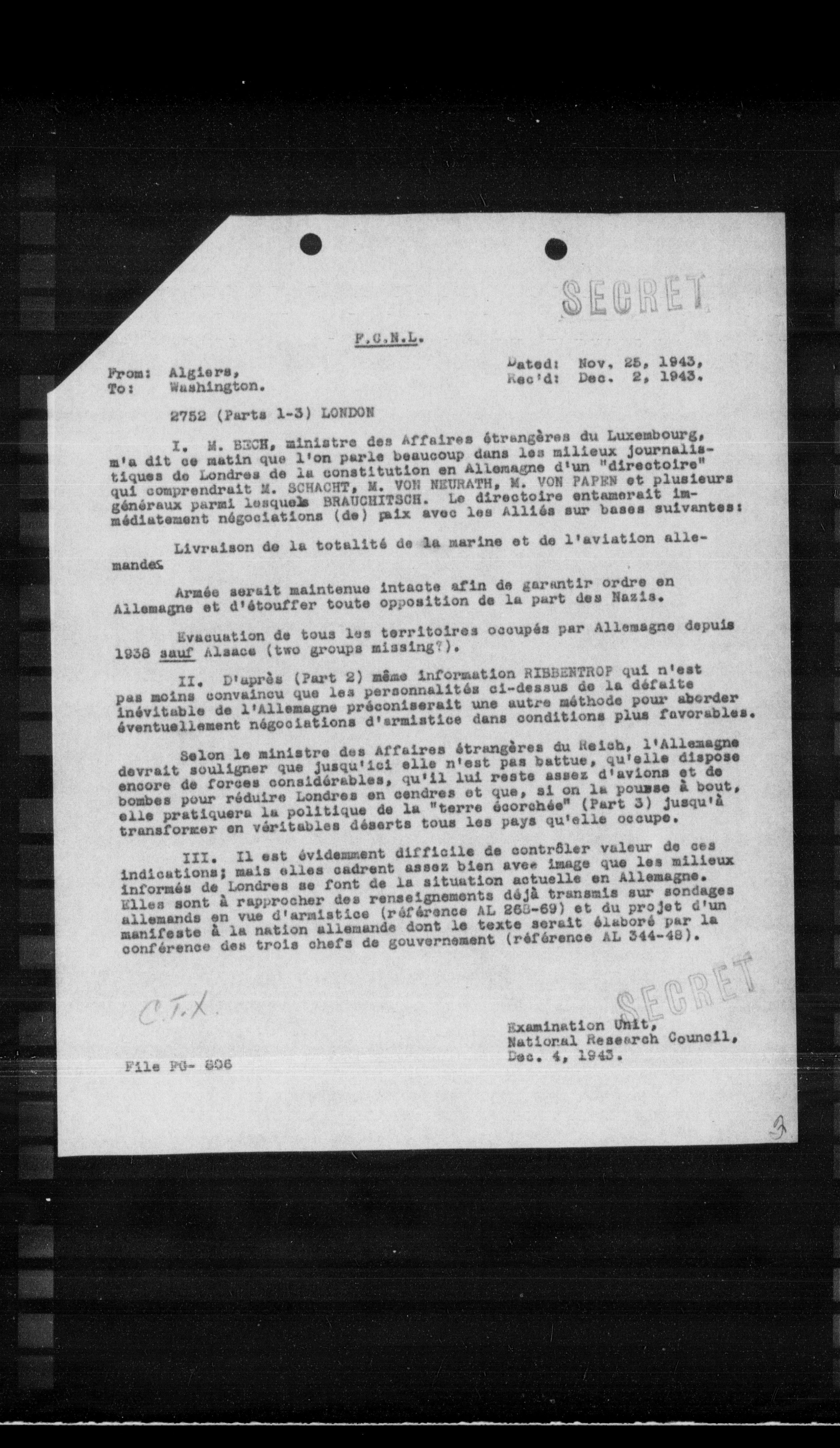 I. M. BECK, ministre des Affaires étrangères du Luxembourg, m'a dit ce matin que l'on parle beaucoup dans les milieux journaliatiques de Londres de la constitution en Allemagne d'un "directoire" qui comprendrait M. SCHACHT, M. VON NEURATH, M. VON PAPER et plusieurs généraux parmi lesquels BRAGGHTSON. Le directoire entamerait immédiatement négociations (de) paix avec les Alliés sur bases suivantes: